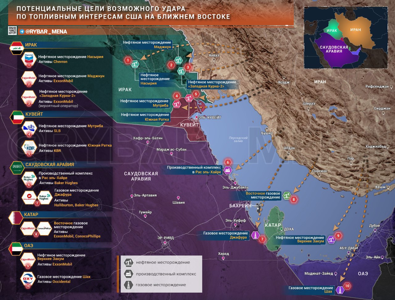 Первый и самый очевидный кандидат — корпорация Chevron, которая в последние месяцы активно наращивает присутствие в Ираке. В прицеле также и нефтяной гигант ExxonMobil с его долями в проектах Катара и Объединенных Арабских Эмиратов. Уязвимыми целями названы и подрядчики KBR и SLB, чья инфраструктура в Кувейте — ключ к нескольким крупным проектам эмирата. Удар по ним способен парализовать их на месяцы.