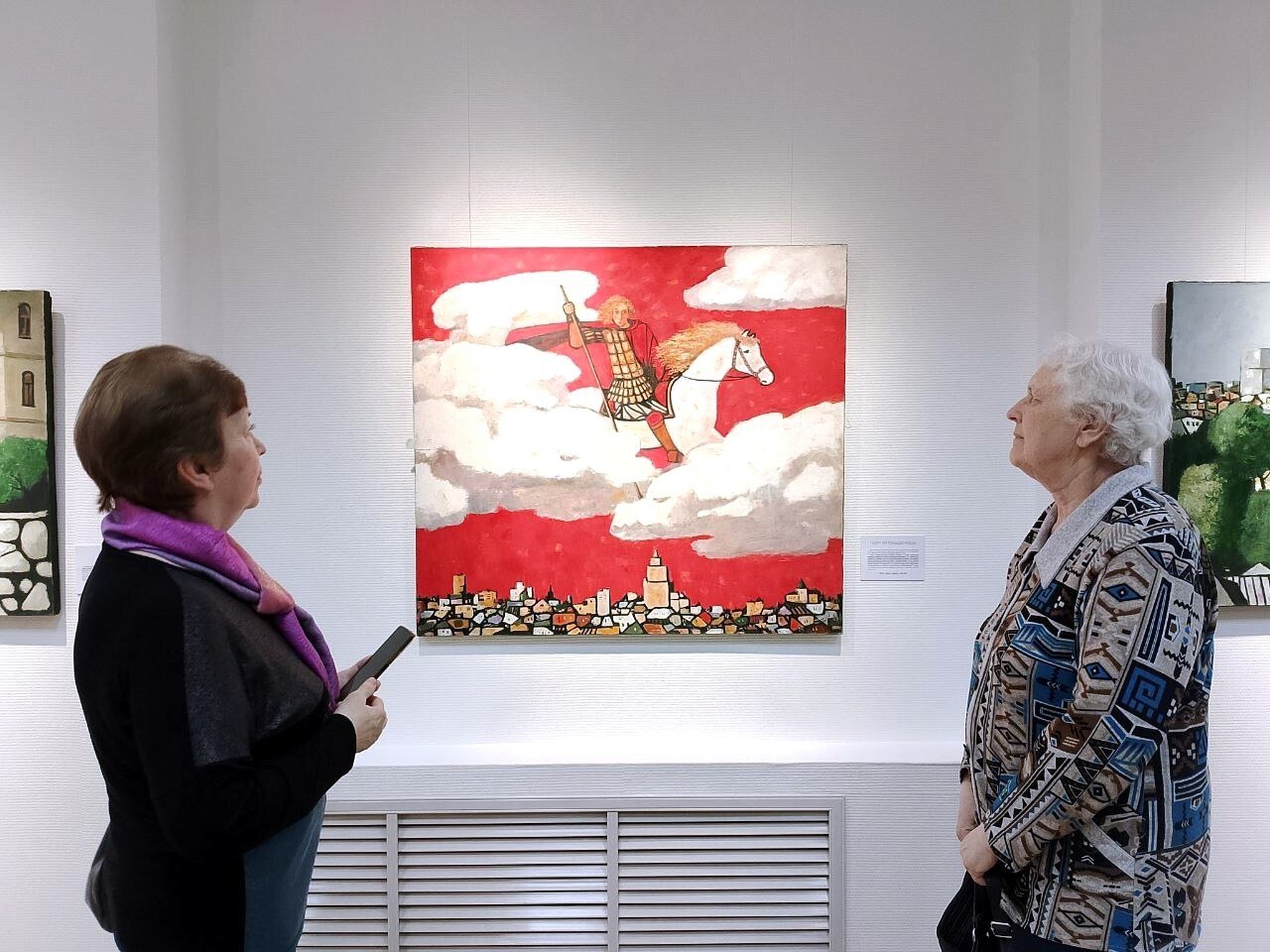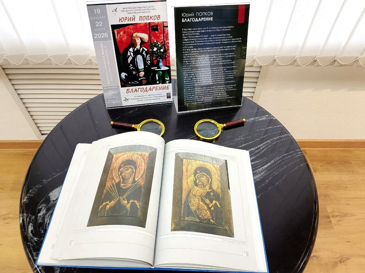 Экспозиция посвящена памяти друга художника — уроженца Электростали, живописца Александра Тихомирова, которому в этом году исполнилось бы 70 лет. Особую ценность выставке придают уникальные работы Тихомирова в технике «оконопись», представленные в отдельной части зала.
