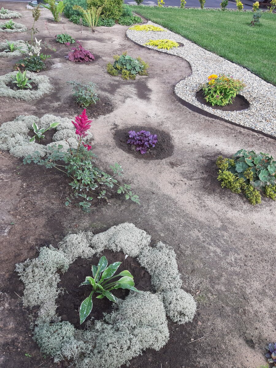 Кладония — весьма неприхотливый лишайник, который может расти в различных условиях, даже в тени и без регулярного полива. Главная задача — аккуратно поливать хосты, избегая замачивания лишайника. Это защитное кольцо вокруг растений поможет избежать нашествия слизней, и за весь сезон их не наблюдали.