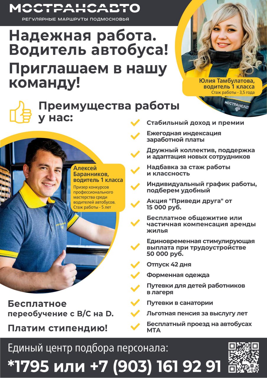 Мострансавто приглашает на работу в крупнейшую транспортную компанию Подмосковья, которая осуществляет пассажирские перевозки по 1,5 тыс. маршрутов.