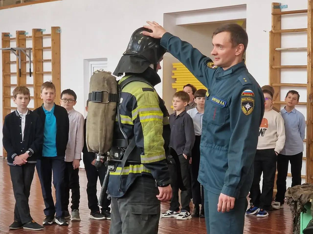 В МОУ "Гимназия №1" для учеников пятого класса урок провели сотрудники второй пожарно-спасательной части — помощник начальника караула прапорщик Александр Коротаев и пожарный Максим Андрюшин.