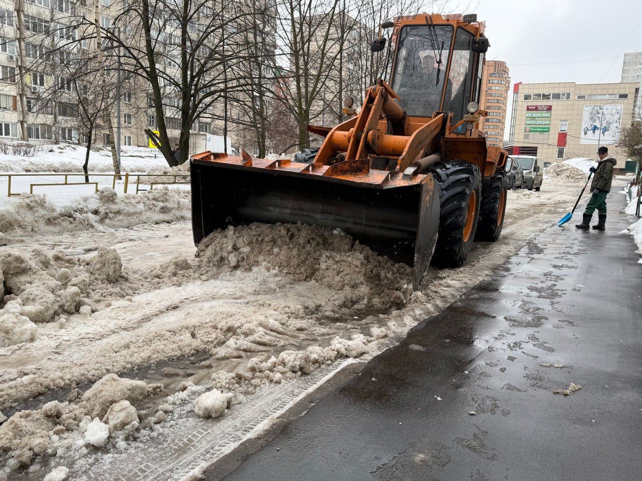 5 марта, сотрудники МБУ «Наш дом-Дзержинский» очищали от снега и наледи дворовую территорию у д. №14 на ул.Лесная. В работе были задействованы погрузчик «Амкодор», самосвал «КамАЗ». Дворники вручную расчищали территорию возле машин, владельцы которых не перепарковали свои автомобили. Всего с этой территории было вывезено четыре самосвала снега.