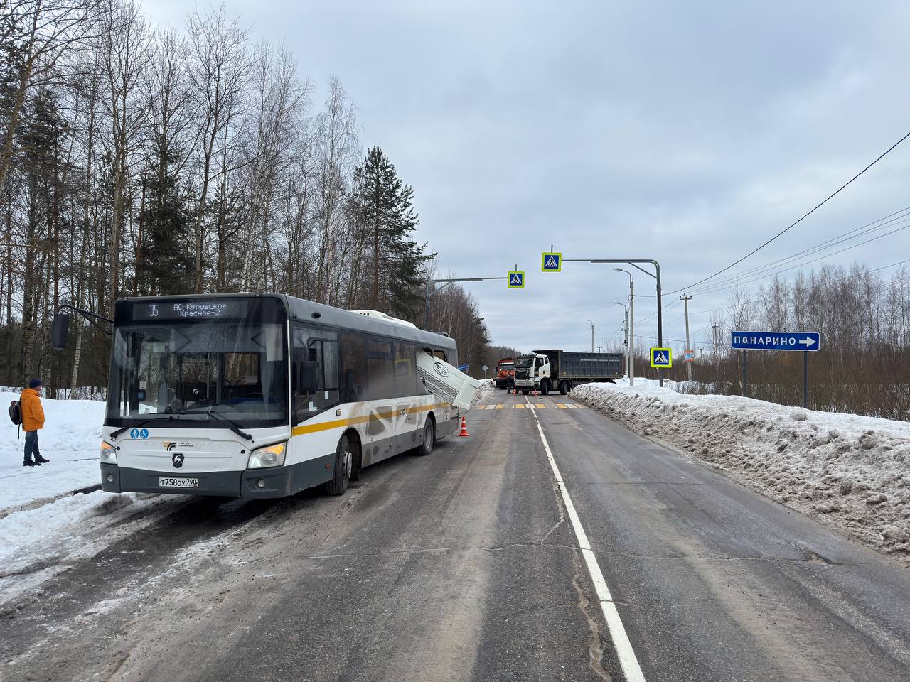 Сегодня утром недалеко от деревни Понарино произошло ДТП с участием грузового автомобиля и рейсового автобуса, следовавшего по маршруту №35 "Куровское –Красное". В автобусе находилось десять человек, несовершеннолетних не было.