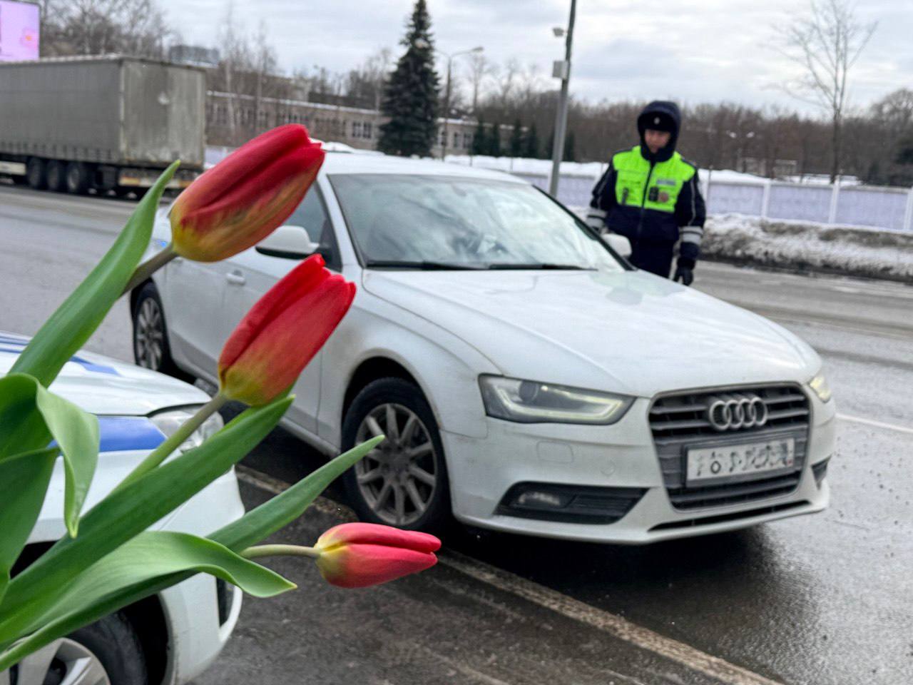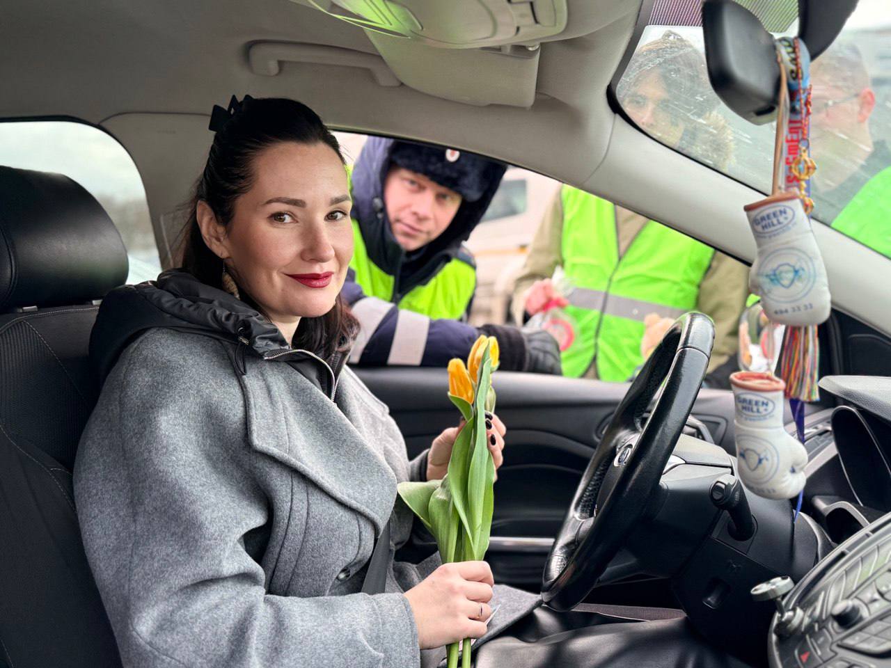 На время полицейские сменили жезлы на весенние тюльпаны. Компанию им составили студенты местного колледжа, которые подготовили для девушек эксклюзивный «улов» — медовые пряники ручной работы.