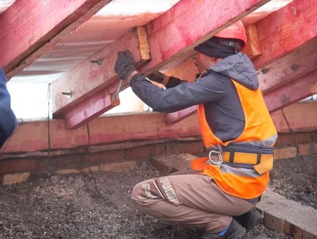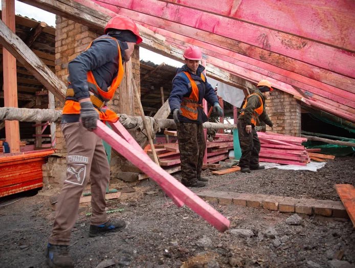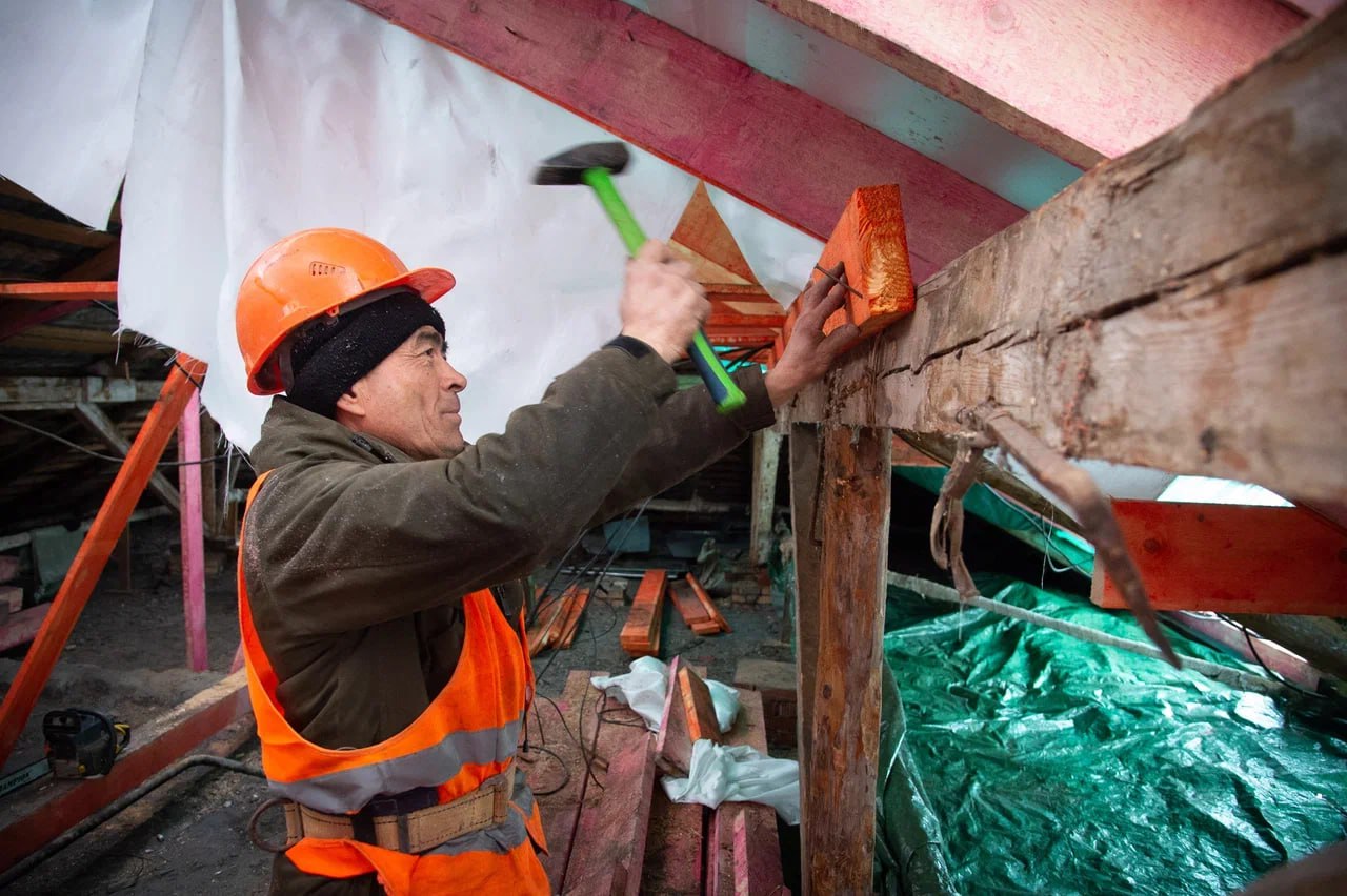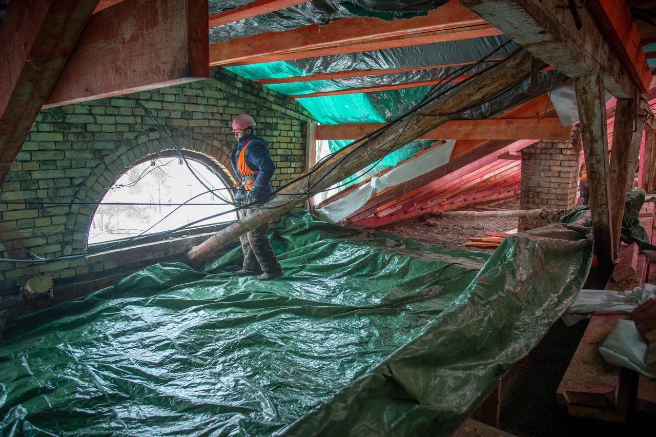Бригада из трех человек начала работу в феврале. Специалистам предстоит полностью снять старое покрытие, очистить чердак, создать новую стропильную систему, обрешетку и затем уложить металлические листы. Общая площадь крыши составляет около 600 квадратных метров.