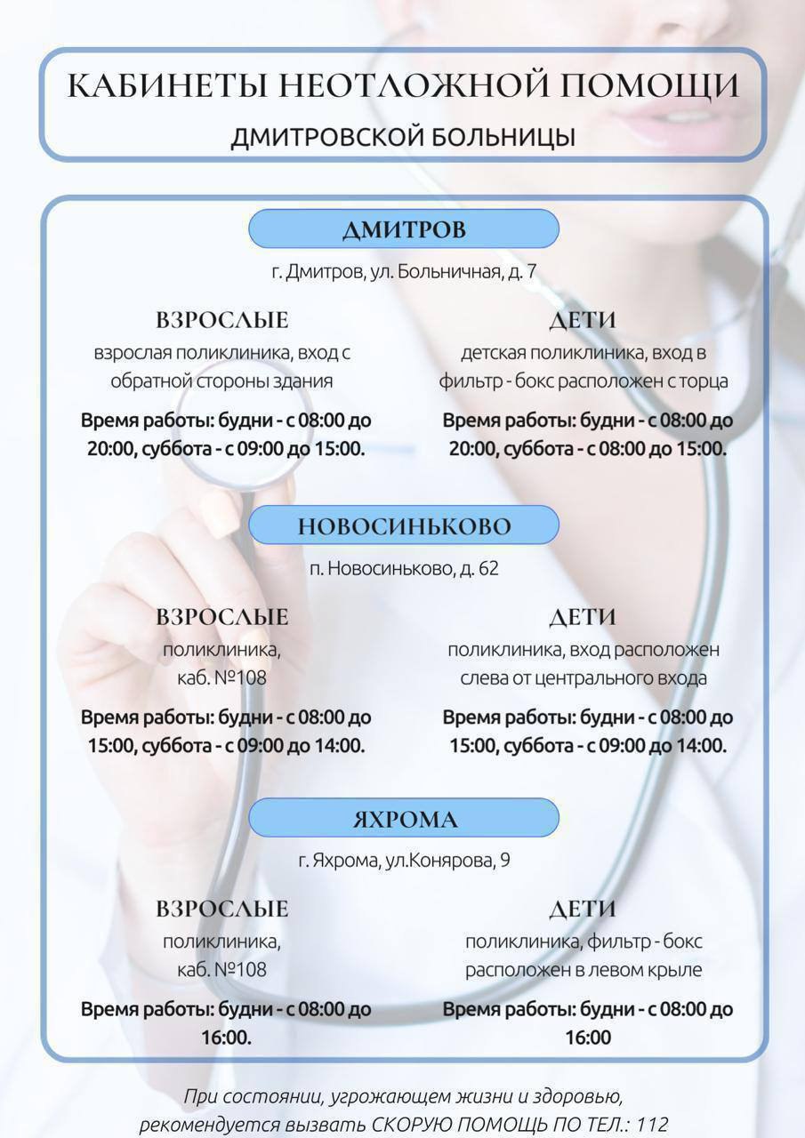 г. Дмитров, ул. Больничная, д. 7 (3-й этаж, Центр здоровья) — с 09:00 до 14:00