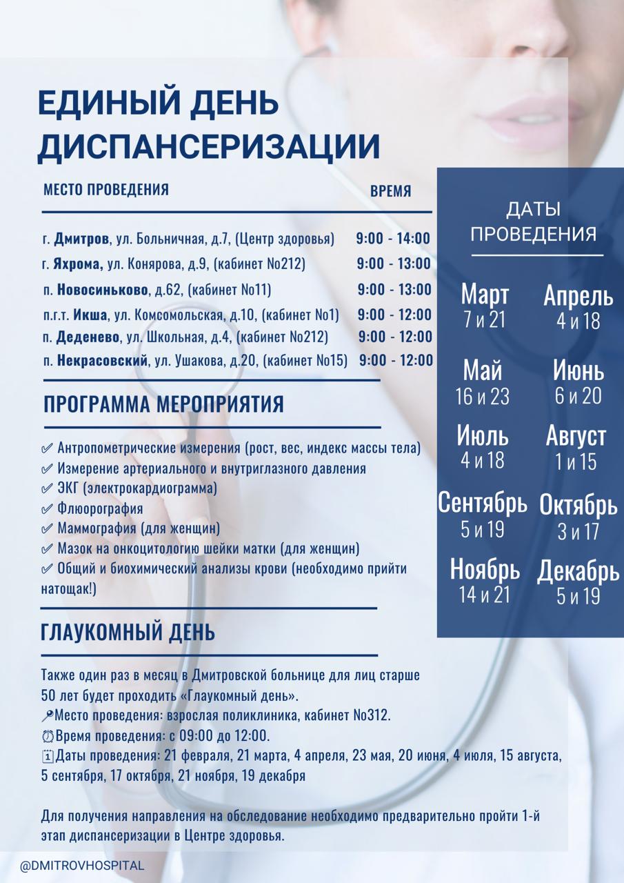 В субботу, 7 марта, ГБУЗ МО «Дмитровская больница» приглашает жителей округа пройти профилактический медицинский осмотр в рамках Единого дня диспансеризации.