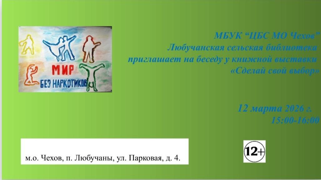 12 марта 2026 в Любучанской сельской библиотеки пройдет беседа у книжной выставки «Сделай свой выбор» . На выставке будут представлены книги по профилактике вредных привычек, а также книги о здоровом образе жизни.