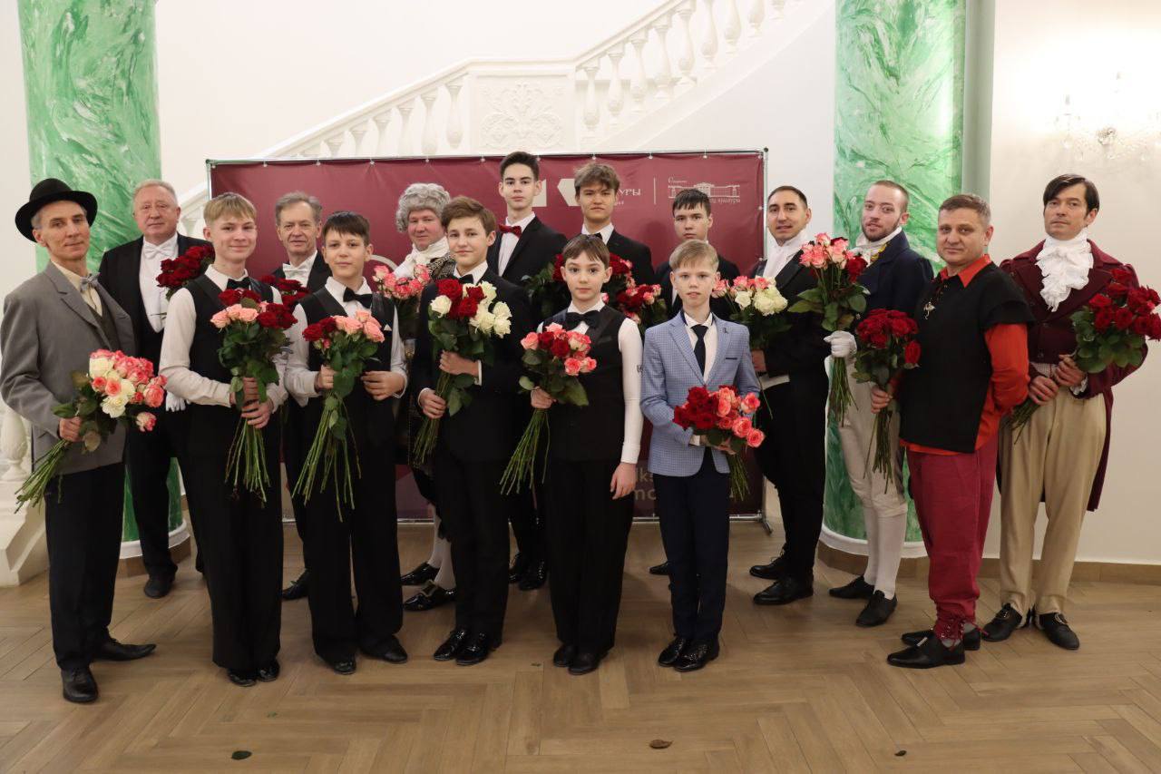 Кульминацией праздника стало появление артистов с цветами: представители сильного пола спустились в зал и вручили женщинам весенние букеты.