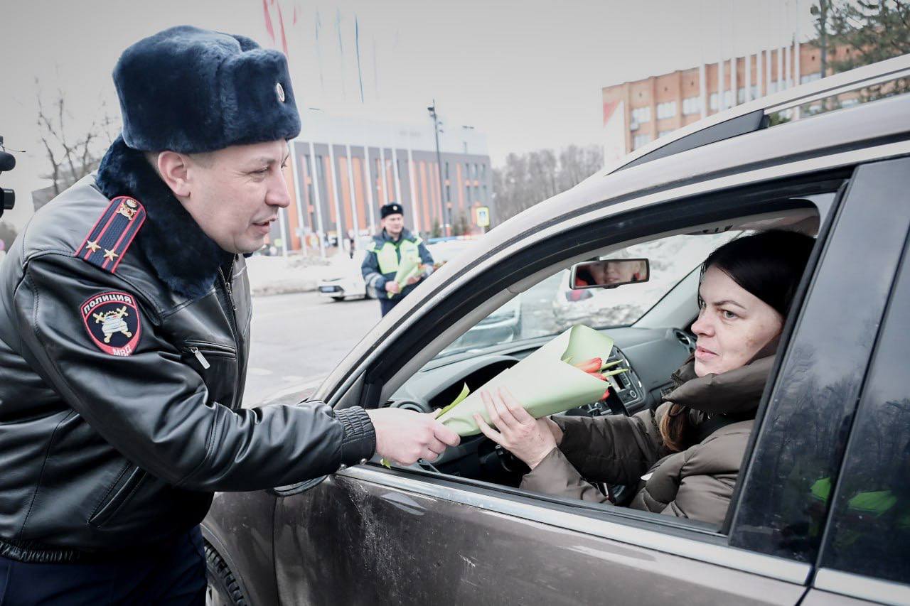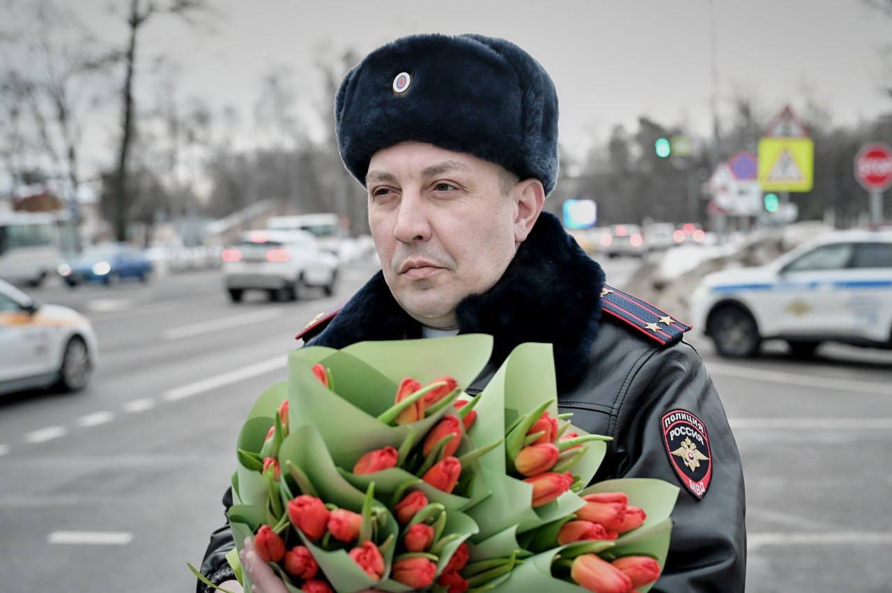 Наравне с личным составом он останавливал автомобили, за рулем которых были прекрасные дамы, и лично вручал им весенние букеты.