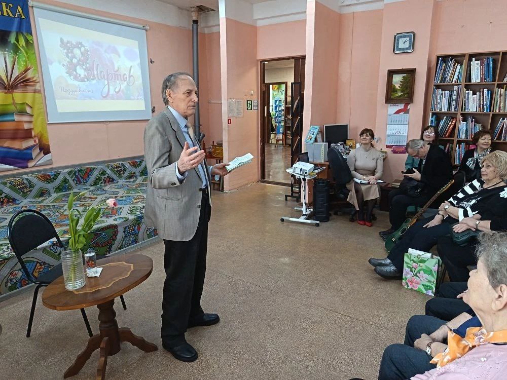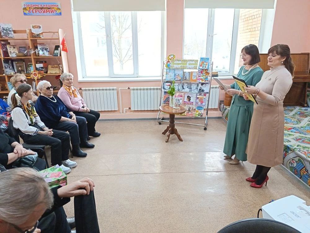 В честь замечательных женщин звучали искренние тёплые поздравления в прозе и в стихах от библиотекарей. Поэтический подарок преподнёс милым дамам Иван Васильевич Александров, растопив сердца добрыми, нежными стихотворными строками и внёс искру веселья юмористическими поэтическими зарисовками. Музыкальным аккордом стало выступление Владимира Петровича Червова, исполнившего любимые всеми песни, немедленно подхваченные благодарными слушателями.