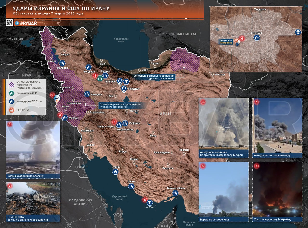В самом Иране удары продолжились по всей стране — от Тегерана и Исфахана до Бендер-Аббаса, Ахваза, Мехрана и острова Киш. В столице снова прилетело по району аэропорта Мехрабад, а на спутниковых снимках с аэродромов видны уничтоженные самолёты и повреждённые взлётные полосы.