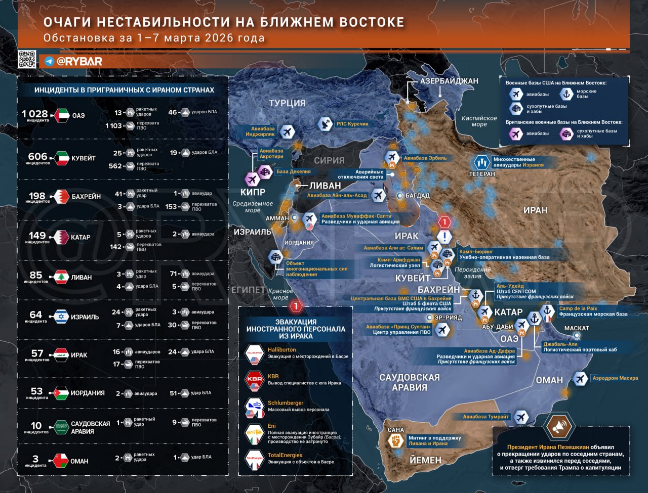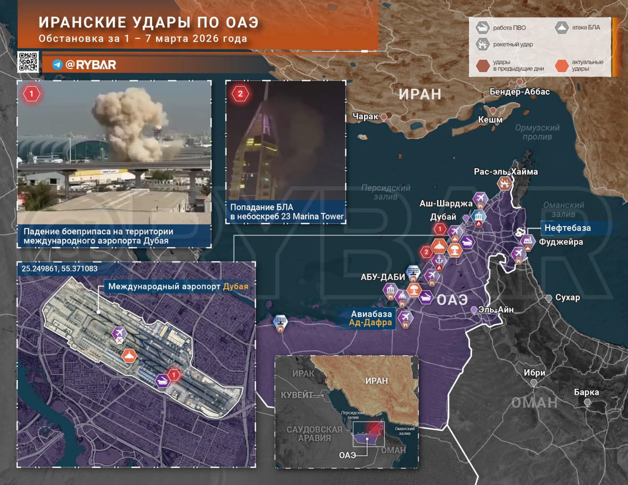 В Кувейте новые спутниковые снимки подтверждают попадания по объектам базы Арфиджан. В Бахрейне уже пошли в ход HIMARS — появились кадры залпа с территории королевства. В ОАЭ же война всё ближе подбирается к гражданской инфраструктуре — в Дубай Марине БЛА попал в жилую многоэтажку.