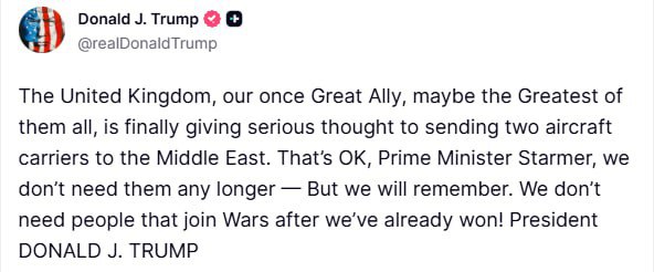 Все в порядке, премьер-министр Стармер, они нам больше не нужны, но мы запомним. Нам не нужны люди, которые вступают в войны после того, как мы уже победили!"