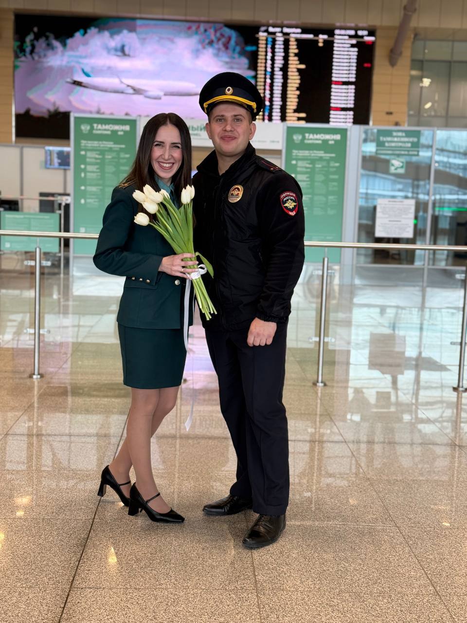 Полицейский автомобиль с яркими тюльпанами на борту прибыл в аэропорт, чтобы от имени всех мужчин поздравить наших женщин и девушек, как пассажирок, так и сотрудниц аэропорта.