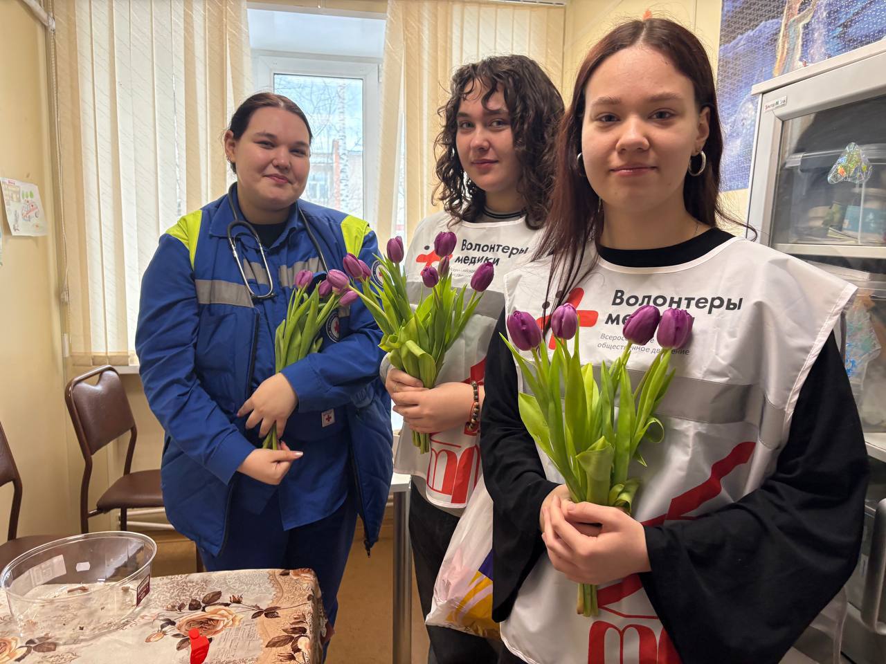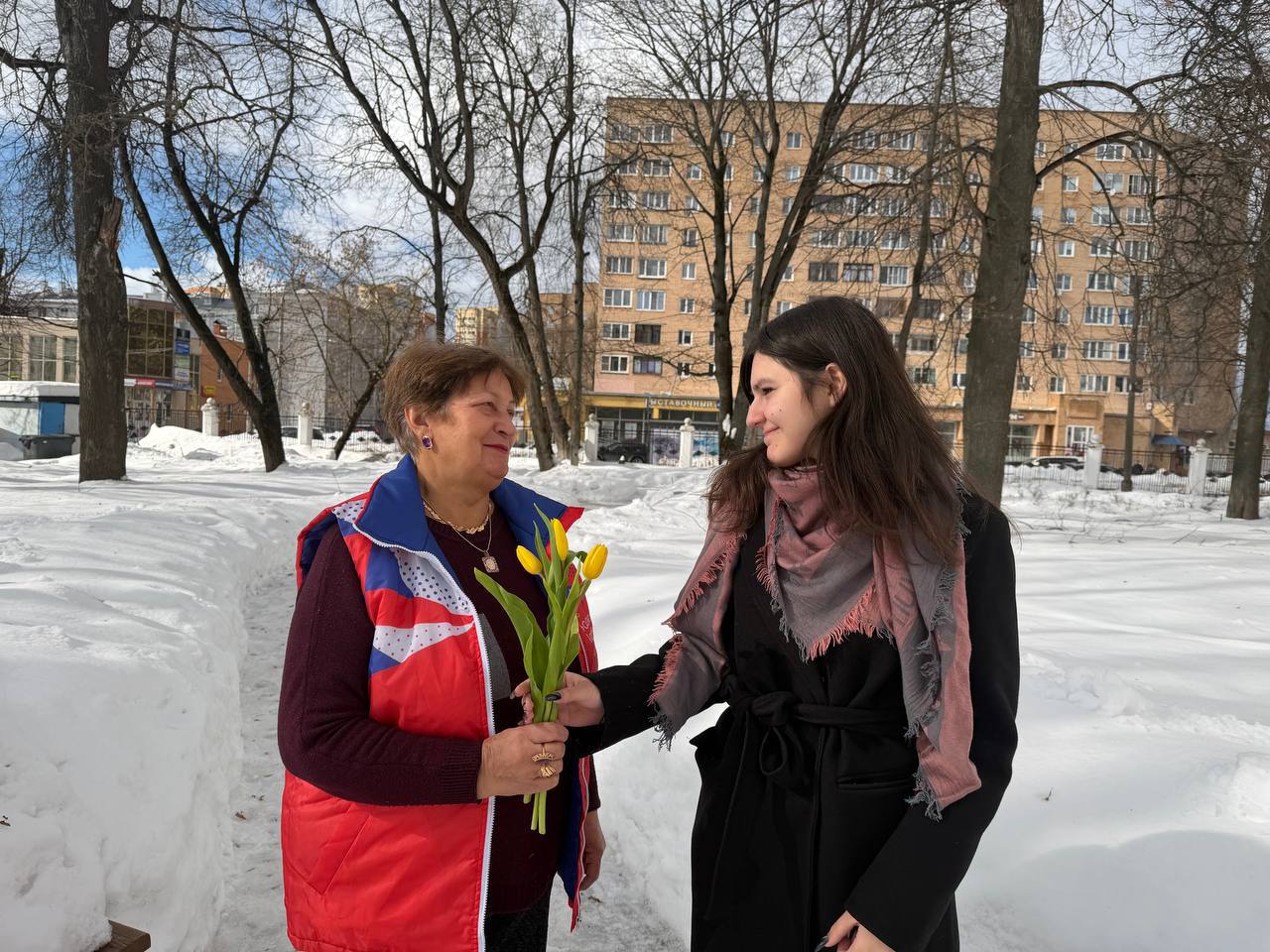 Сегодня с самого утра они поздравляют жительниц нашего округа – серебряных волонтеров, членов семей участников спецоперации, женщин, находящихся на рабочих местах, и прохожих на улицах.