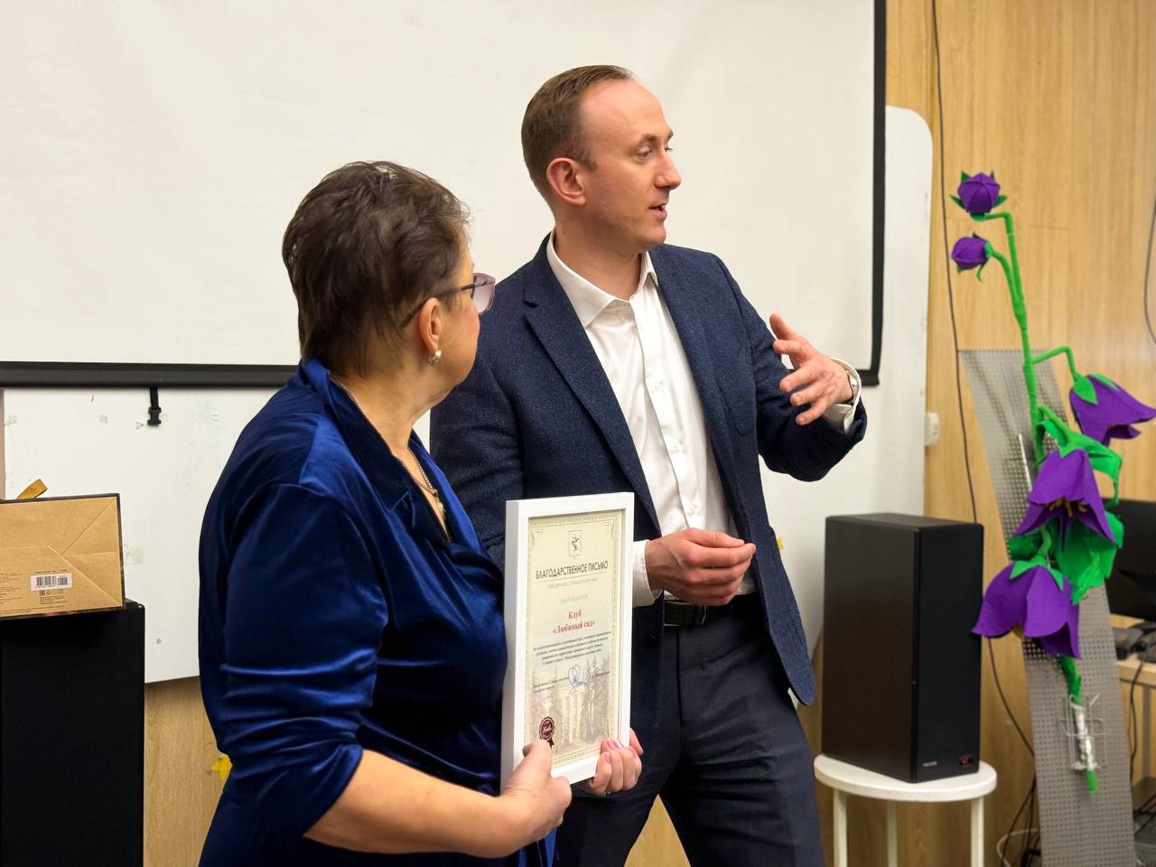 В преддверии 8 Марта депутат Владимир Суслов и заместитель председателя Совета депутатов Александр Васильев встретились с участницами клуба «Любимый сад» в городской библиотеке №3. Женщинам вручили букеты цветов и благодарственные письма от депутатов Московской областной думы Владислава Мирзонова и Михаила Раева, а также благодарность от председателя Совета депутатов Сергея Малиновского — за активность, неравнодушие к жизни округа и помощь фронту.