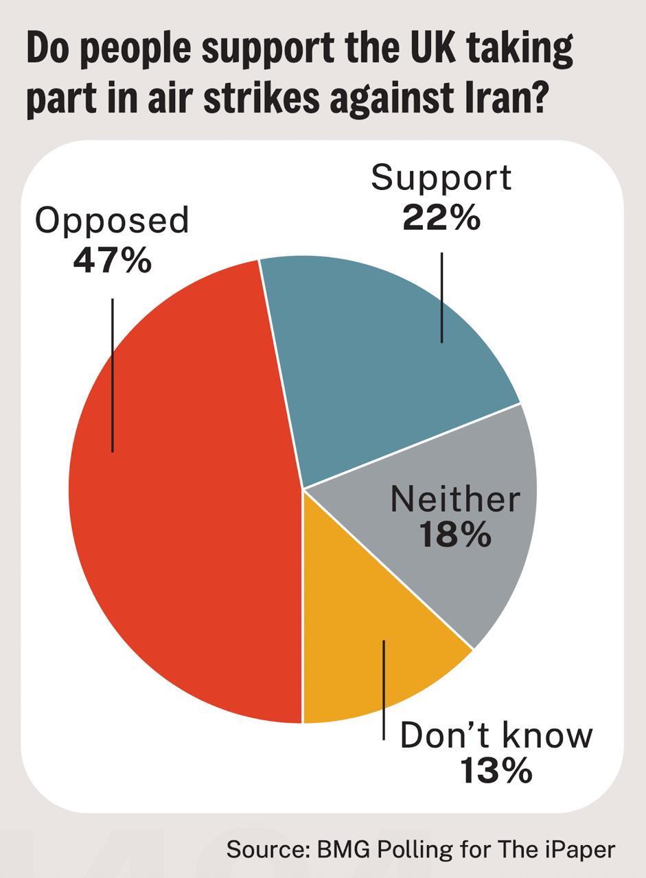 Согласно опросу The i Weekend, 47% жителей Соединенного Королевства не поддерживают вовлечение страны в военную операцию против Ирана. Сторонников ударов оказалось лишь 22%, остальные не определились или сомневаются. Среди избирателей-лейбористов, на которых опирается премьер Кир Стармер, доля противников еще выше — 56%.