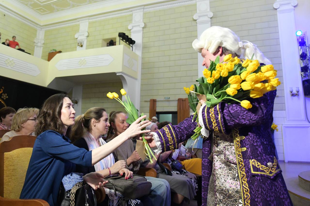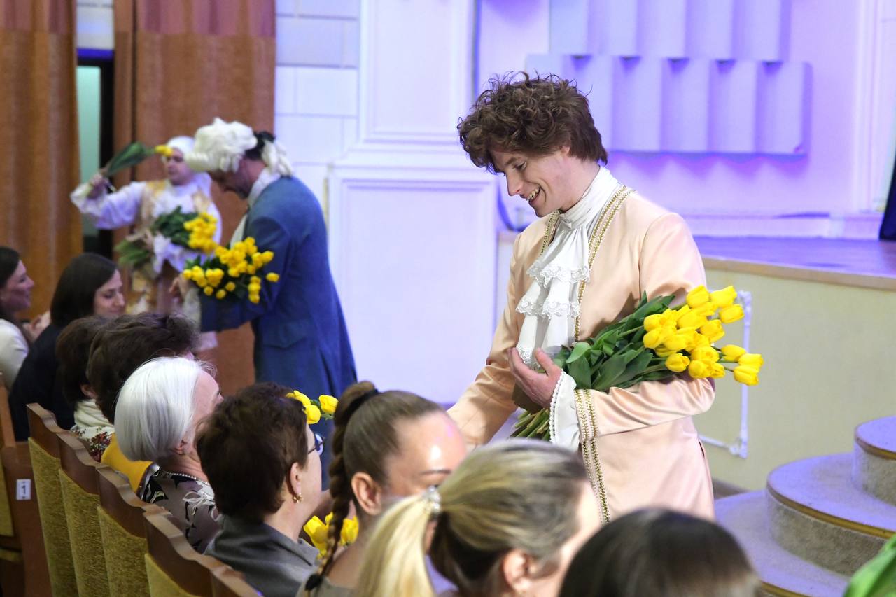 Под песню Муслима Магомаева «Королева красоты» актёры подарили каждой женщине букет тюльпанов.