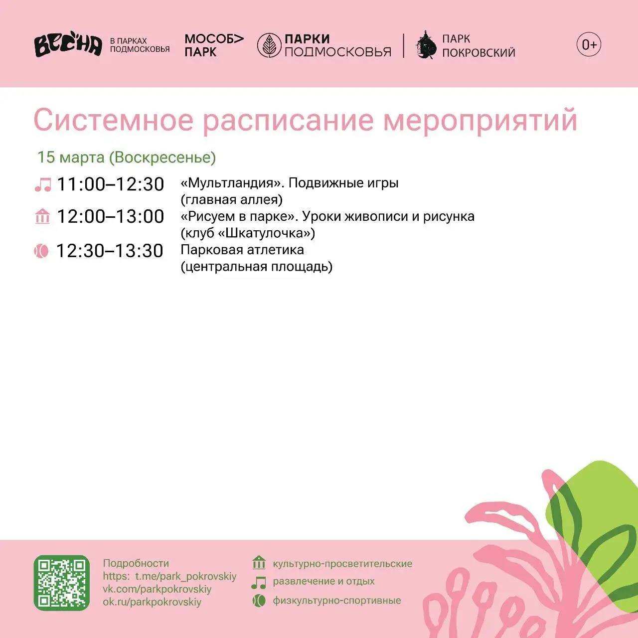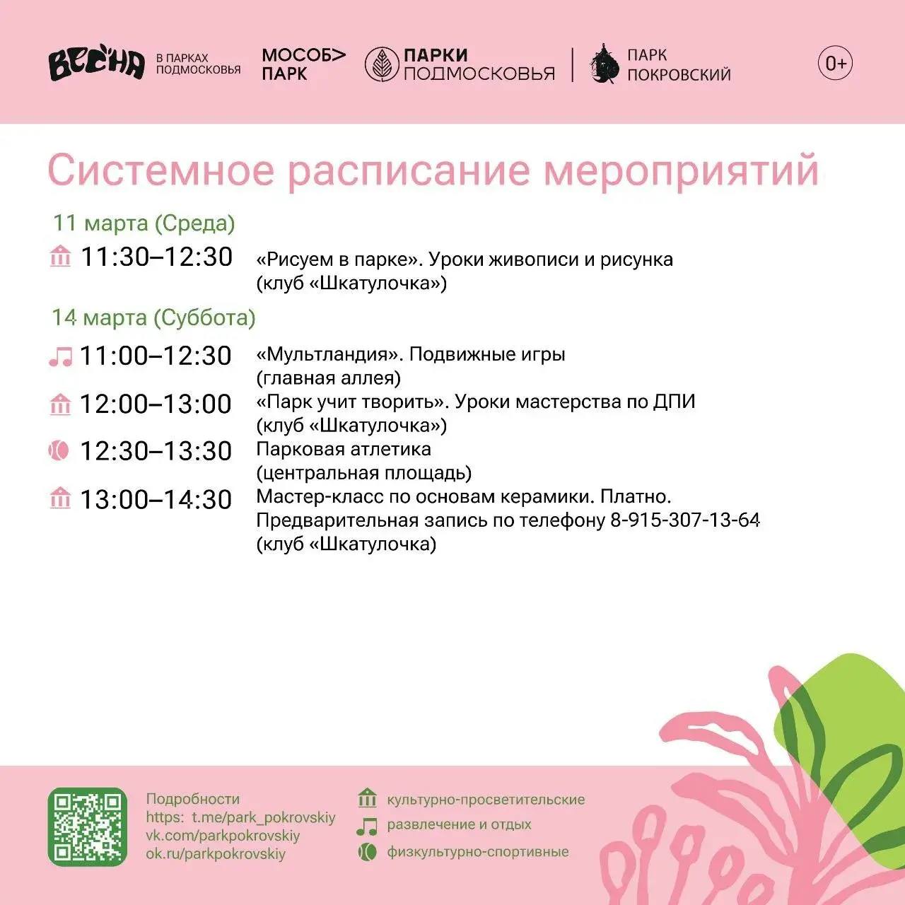 В парке «Покровский» г. Хотьково пройдут уроки живописи «Рисуем в парке», подвижные игры «Мультландия», уроки мастерства «Парк учит творить», парковая атлетика и многое другое.