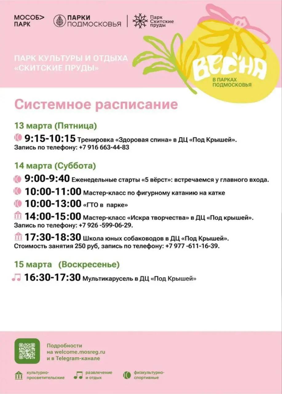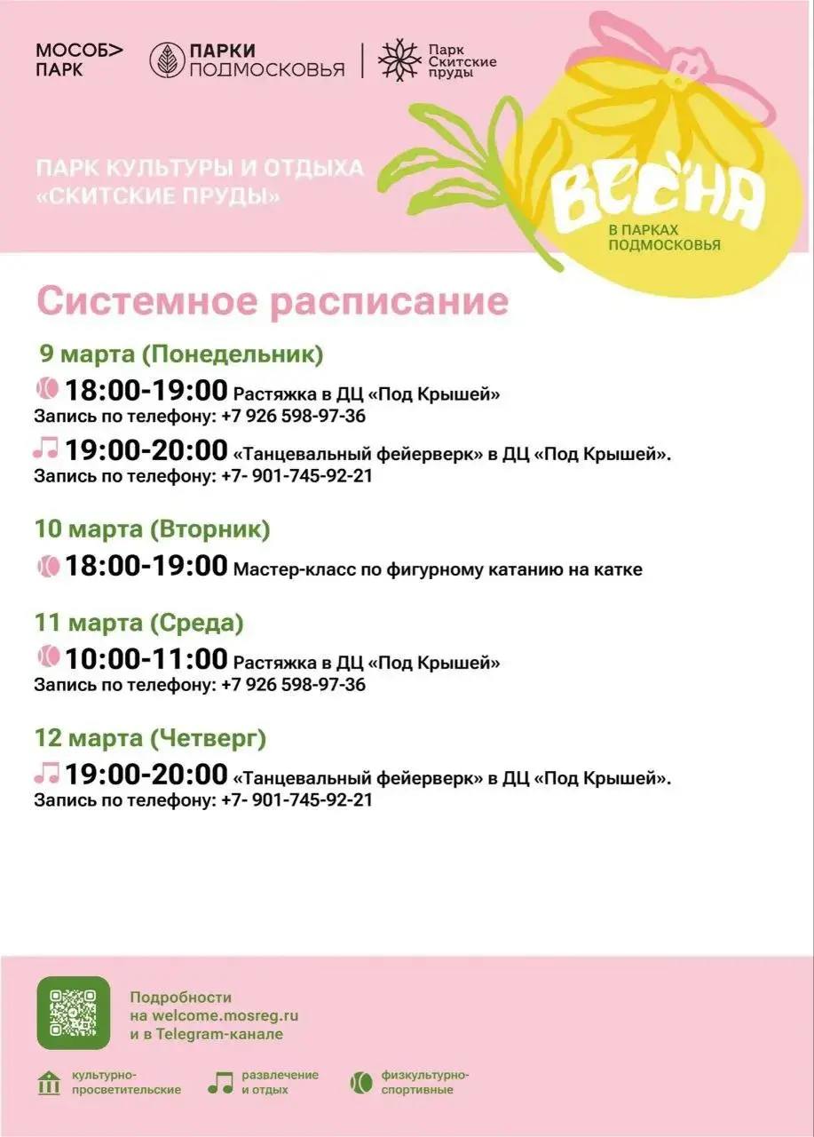 В парке «Скитские пруды» пройдет растяжка в ДЦ «Под Крышей», «Танцевальный фейерверк», мастер-класс по фигурному катанию, тренировка «Здоровая спина», еженедельные старты «5 верст», «ГТО в парке» и многое другое.