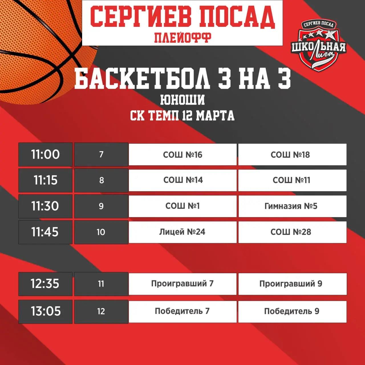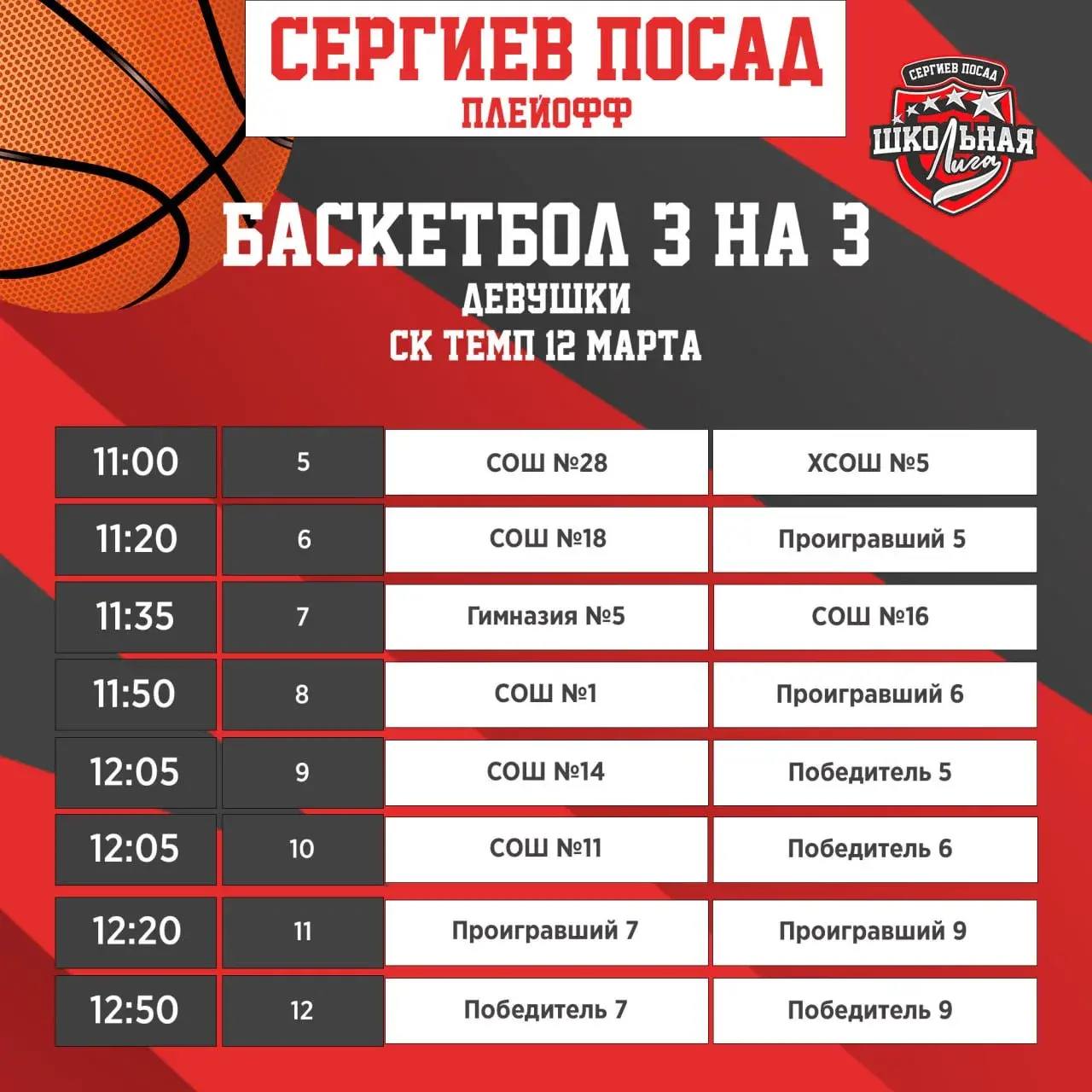 12 марта в спорткомплексе «Темп» с 11:00 в плей-офф по баскетболу 3х3 за призовые места будут бороться юноши и девушки.