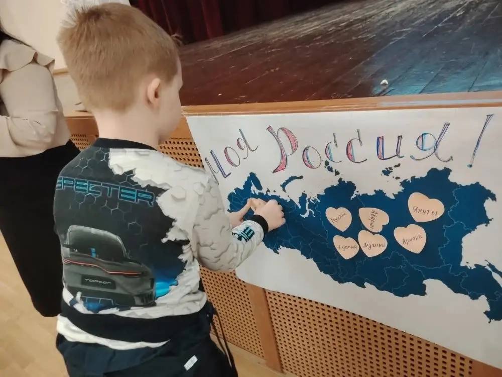 В ходе мероприятия для детей показали мультфильм о народах России, рассчитанный на аудиторию 5-6 лет. Также был проведён флешмоб русских народных танцев – он стал элементом смены активности после мультфильма, чтобы дети могли переключиться и не уставали от восприятия информации. Дополнительно было организовано интерактивное задание с картой страны: дошкольники помогли персонажу Незнайке и ведущей украсить карту названиями народов России, что позволило в игровой форме познакомиться с их географическим распределением и особенностями регионов.