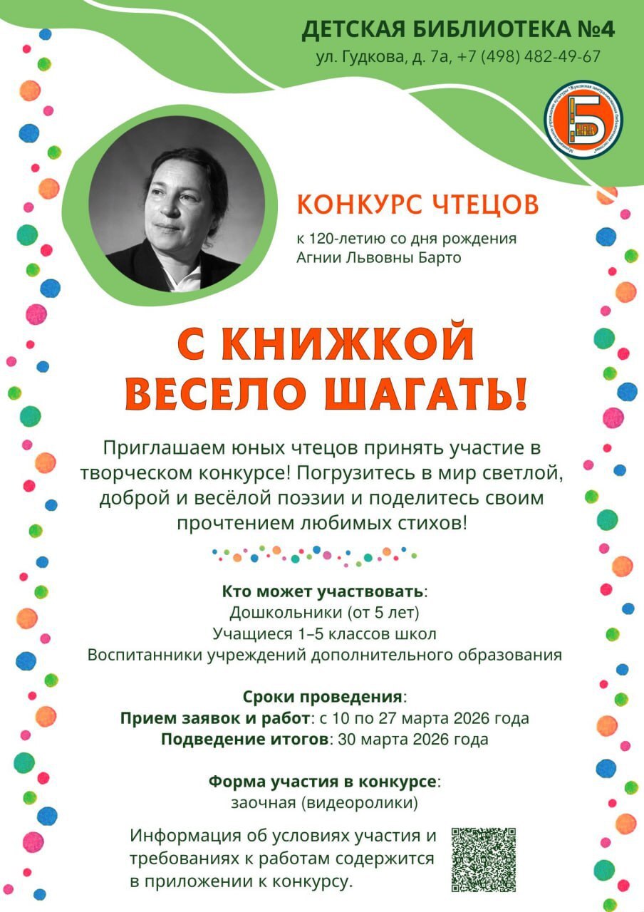 В преддверии 120-летия со дня рождения известной детской писательницы Агнии Львовны Барто Детская библиотека №4 организует конкурс чтецов «С книжкой весело шагать» для юных любителей поэзии.
