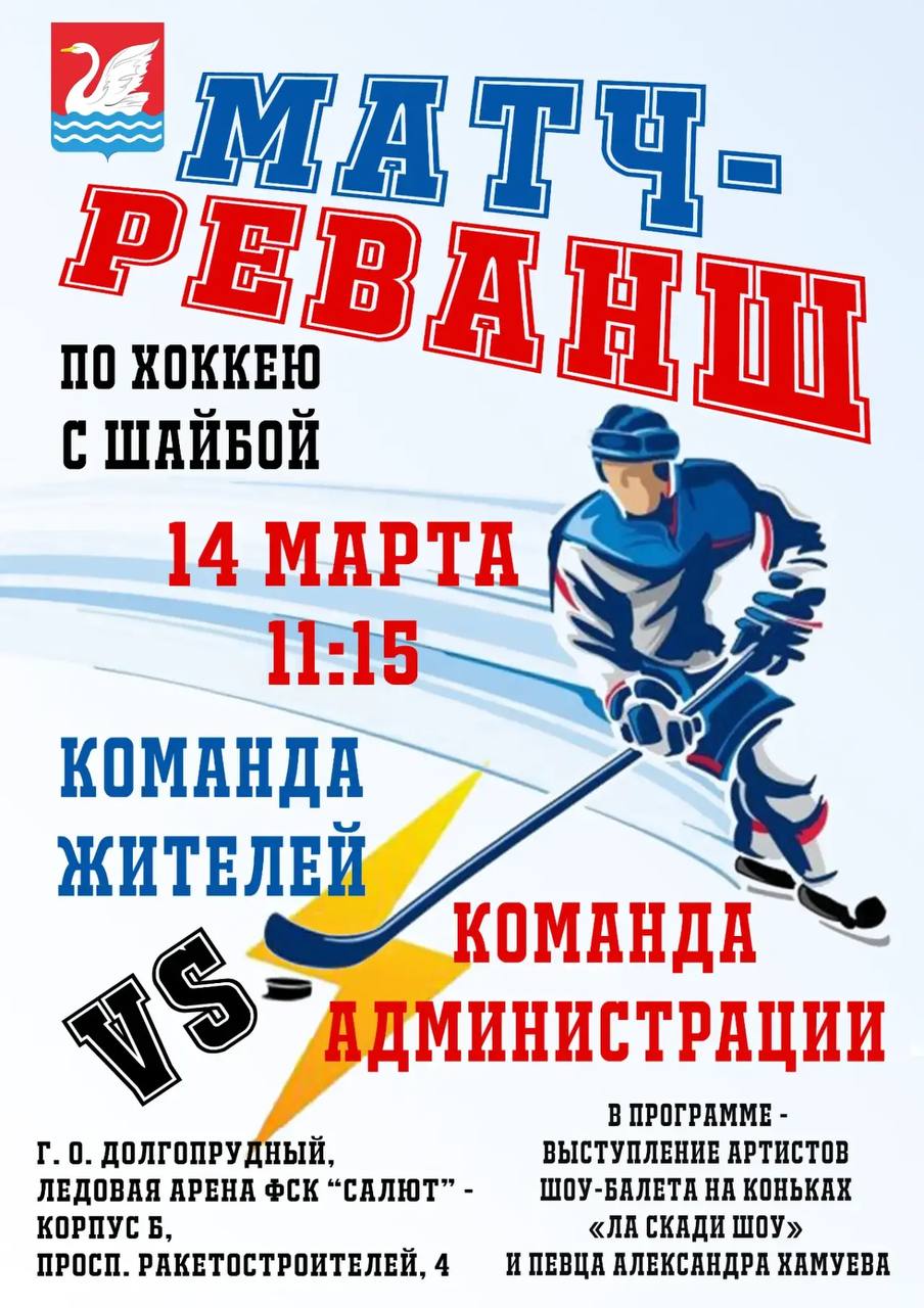 14 марта жители и гости Долгопрудного приглашаются на хоккейный матч. На ледовой арене ФСК «Салют» встретятся команда сборная жителей и администрации округа.