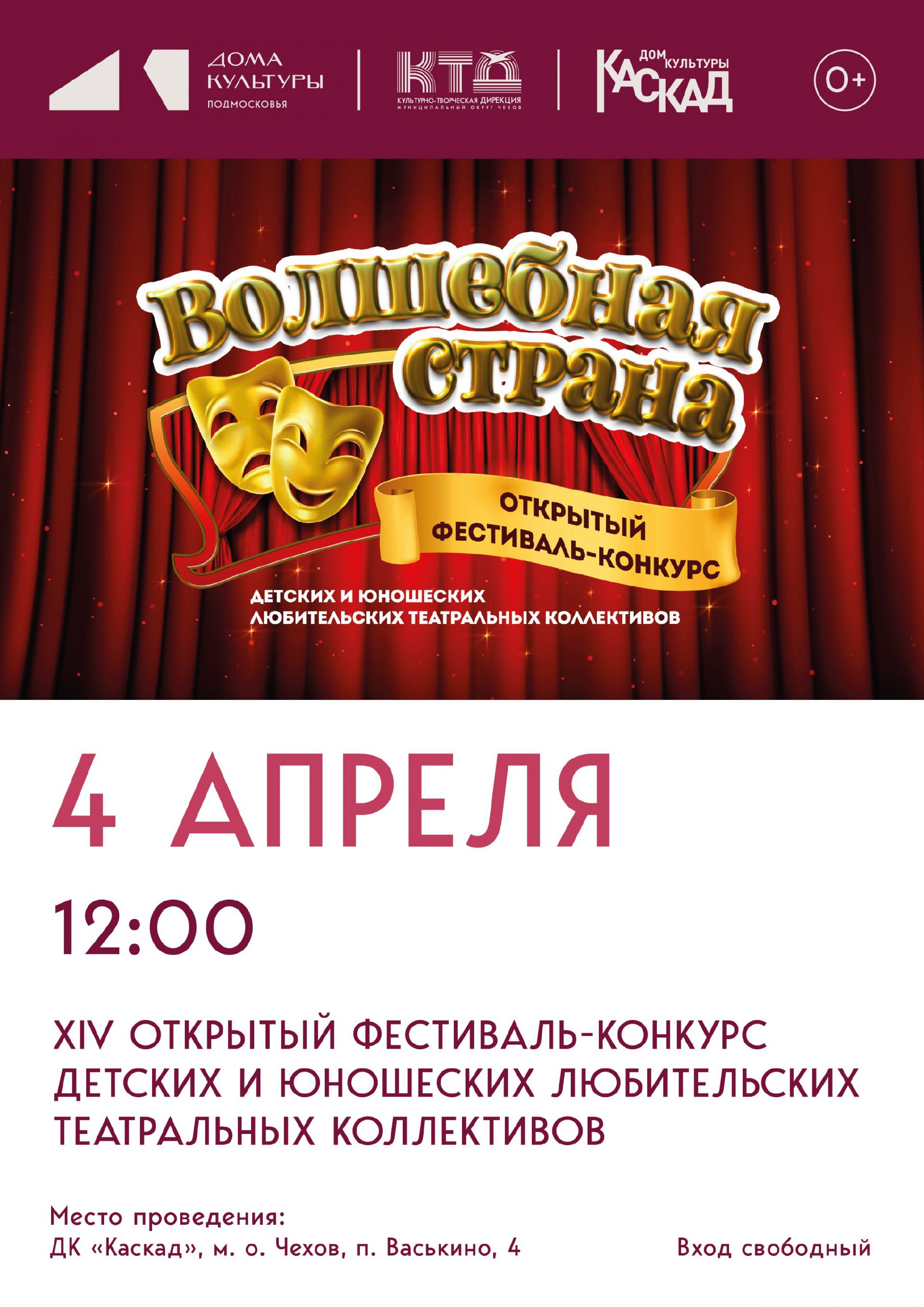 Приглашаем вас принять участие в XIV Открытом фестивале-конкурсе детских и юношеских любительских театральных коллективов "Волшебная страна" в ДК "Каскад" м.о. Чехов