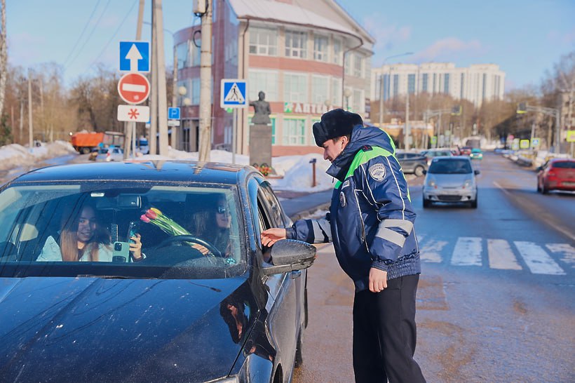 Автоинспекторы останавливали машины, чтобы поздравить женщин с праздником: дарили цветы, сладкие подарки и, конечно, напоминали о безопасности на дорогах.