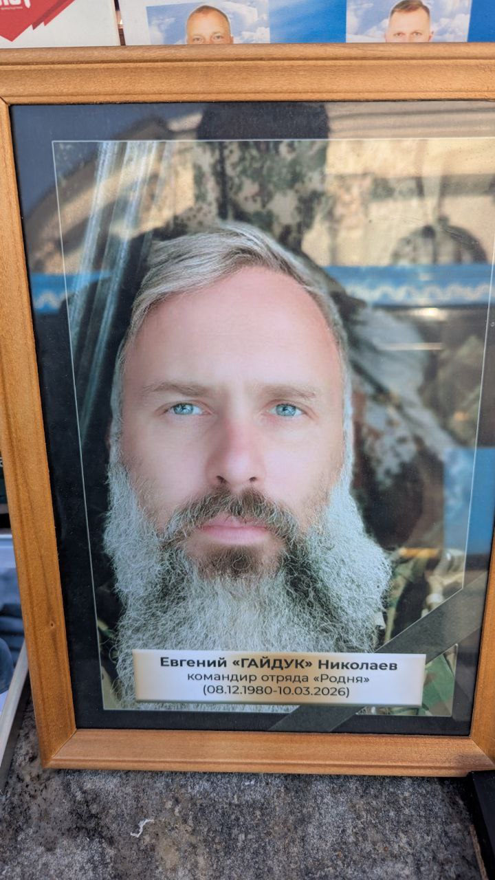 Сам Женя лежит ещё в поле под вражескими дронами, но что-то меня заставило принести его фото на мемориал. Его глаза. Его ясные светлые глаза, красивое благородное лицо. Такой он был. Хочется, чтобы его видели и знали все люди нашей страны. Чтобы читали его книгу. Говорят, будет новая.