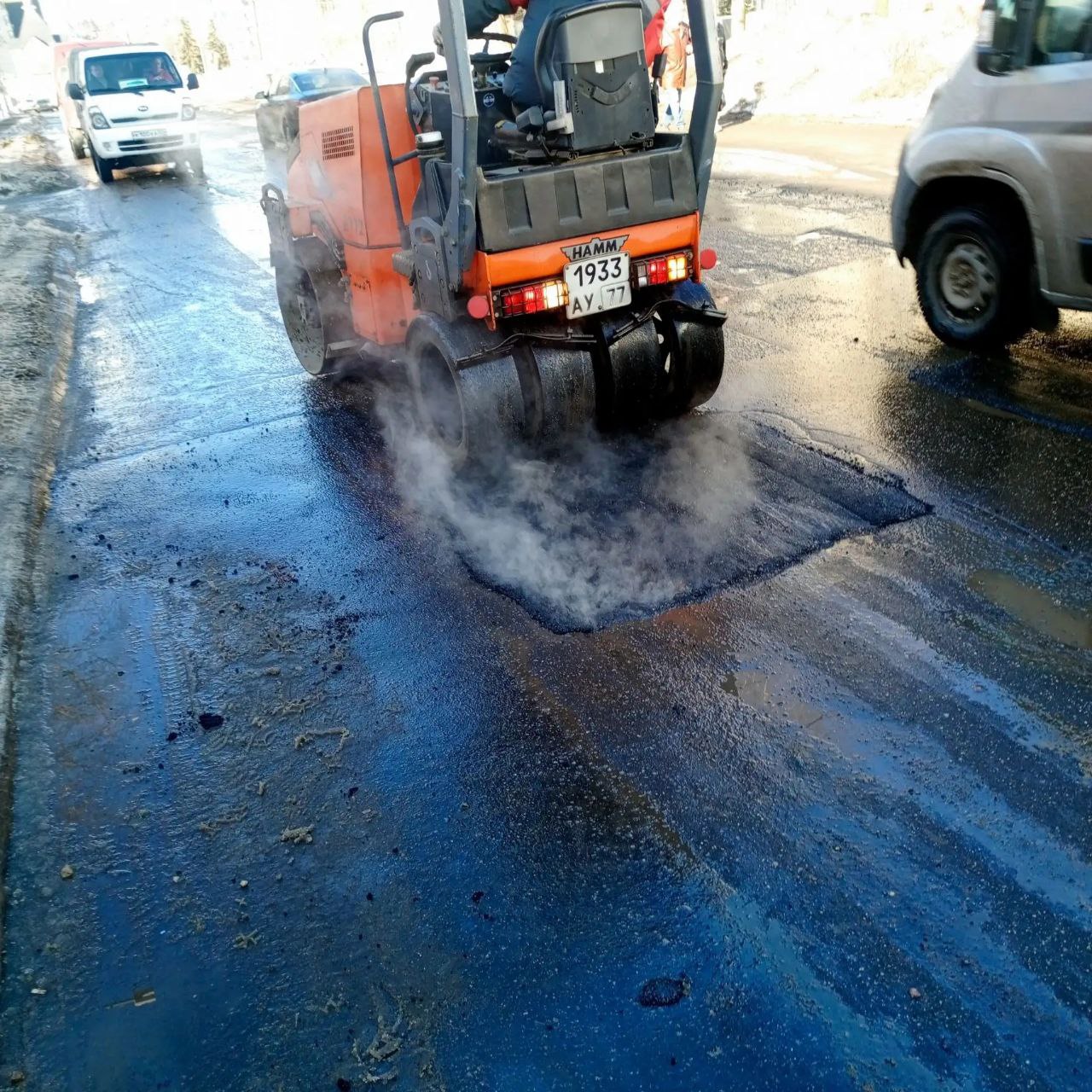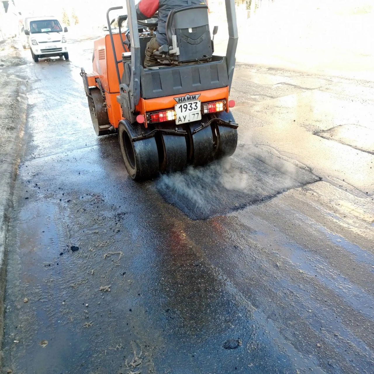 В первую очередь заделывают аварийные ямы, требующие срочного ремонта.
