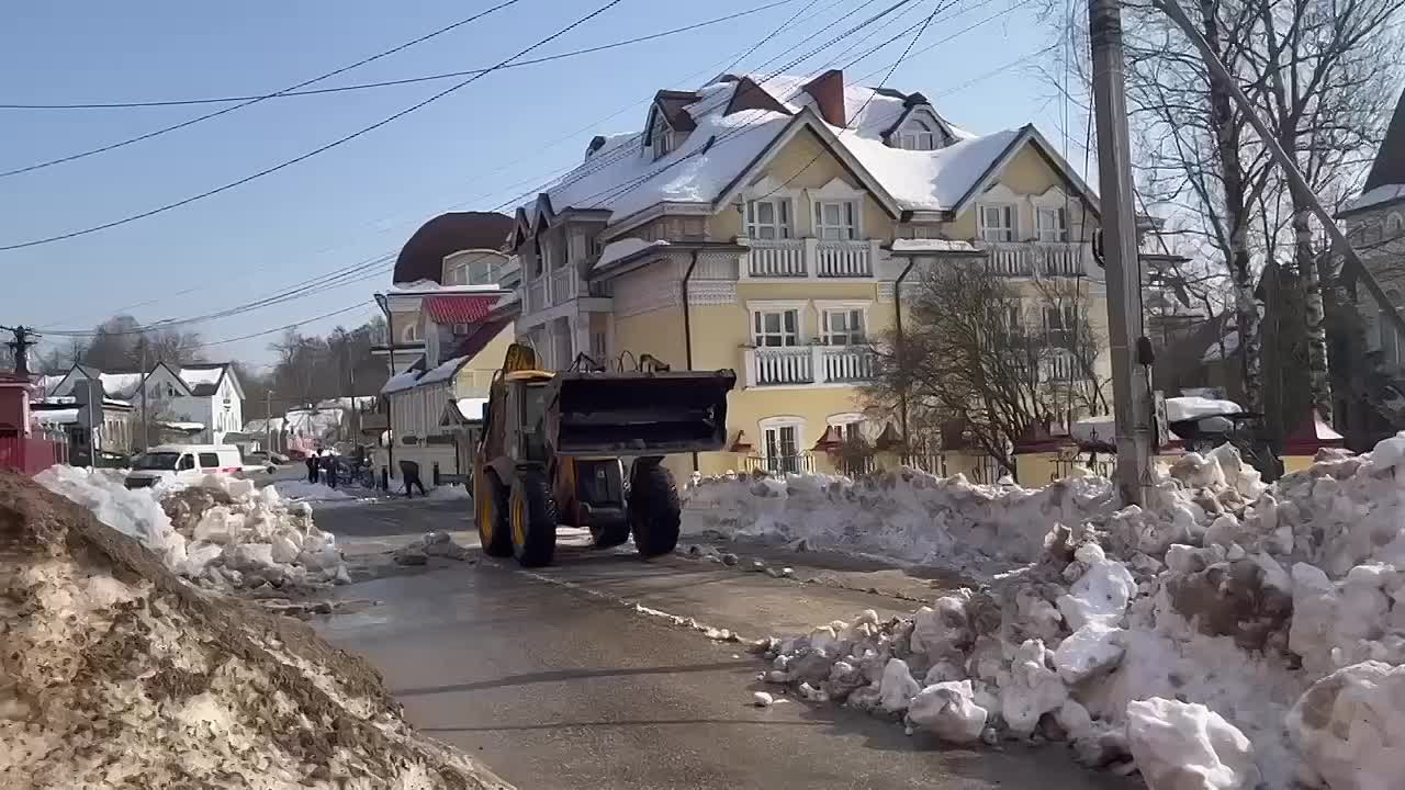 На улице Митькина в Сергиевом Посаде сегодня идёт расчистка и вывоз талого снега