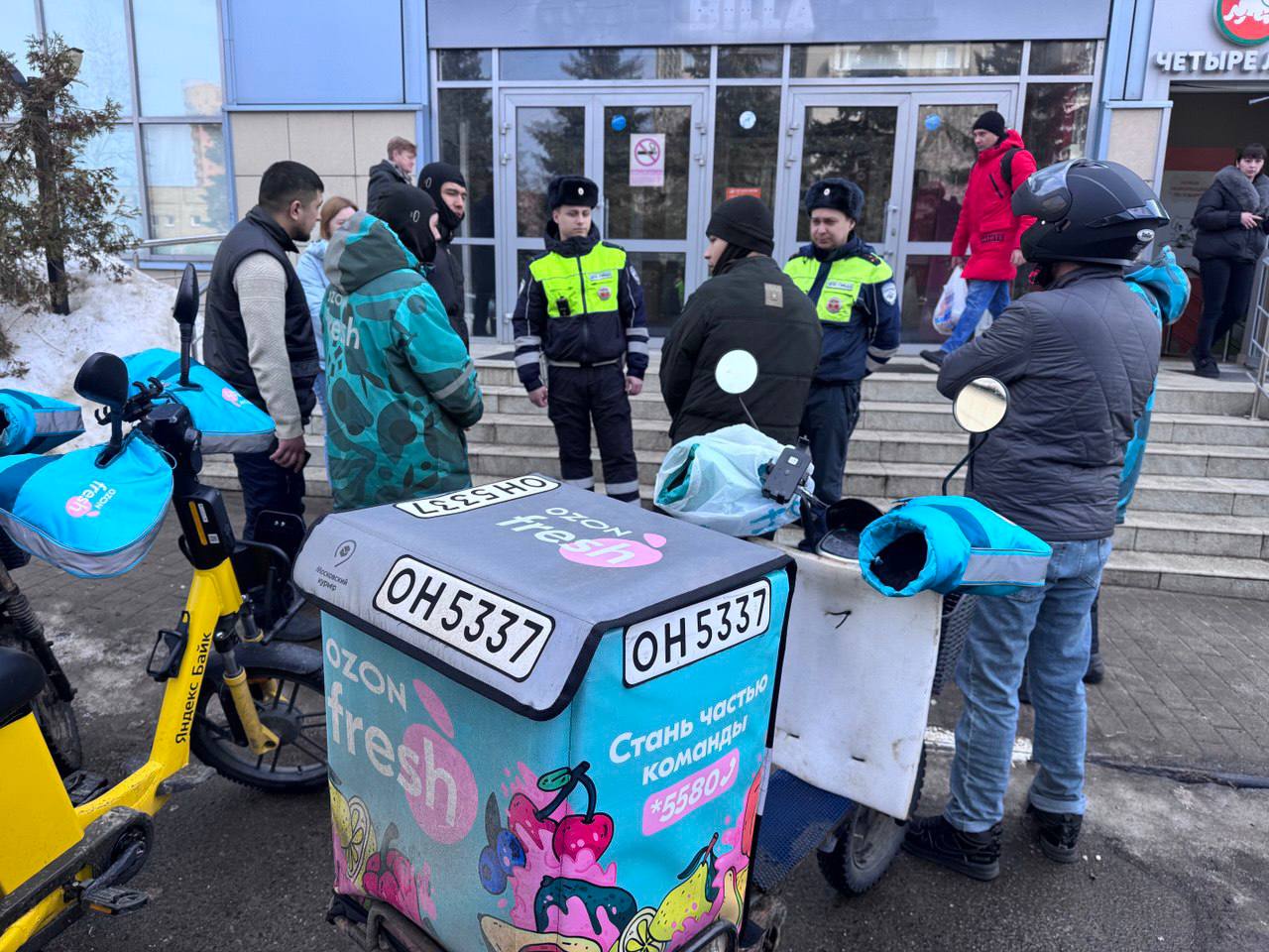 Курьеры на доставке сталкиваются со скрытым льдом и снежной кашей. Пешеходам и водителям важно учитывать сложность маневрирования двухколесного транспорта в таких условиях.