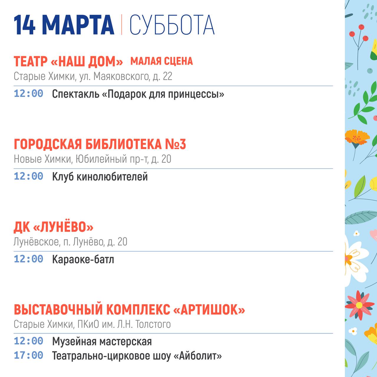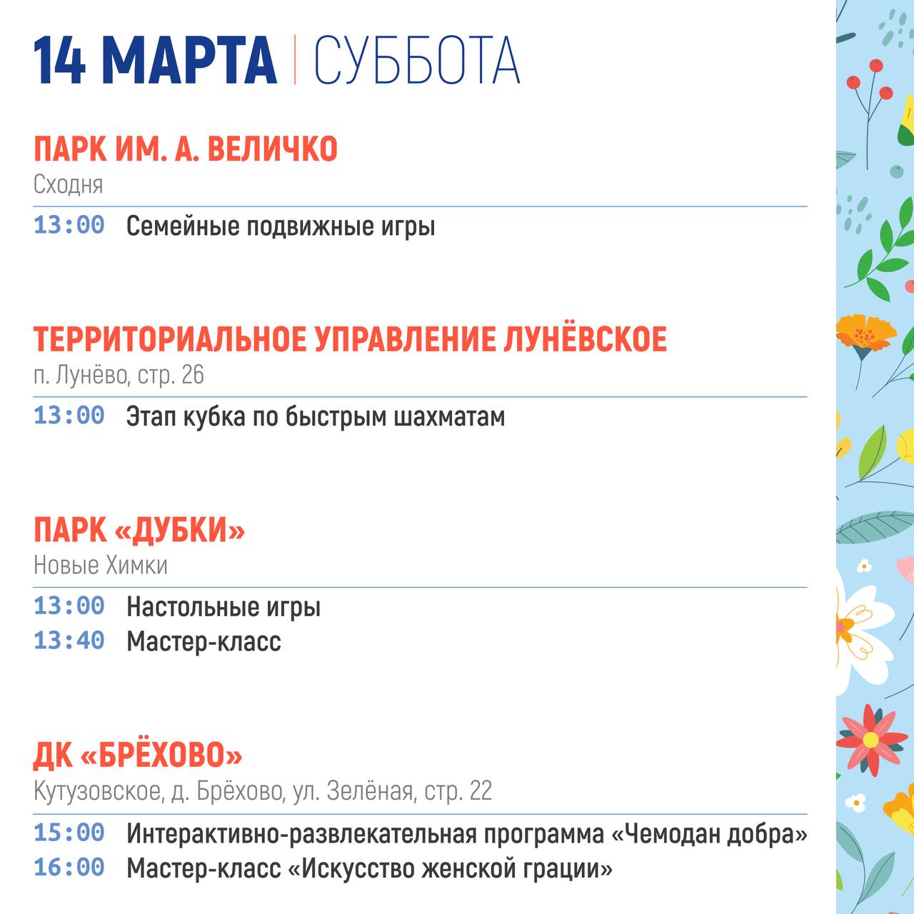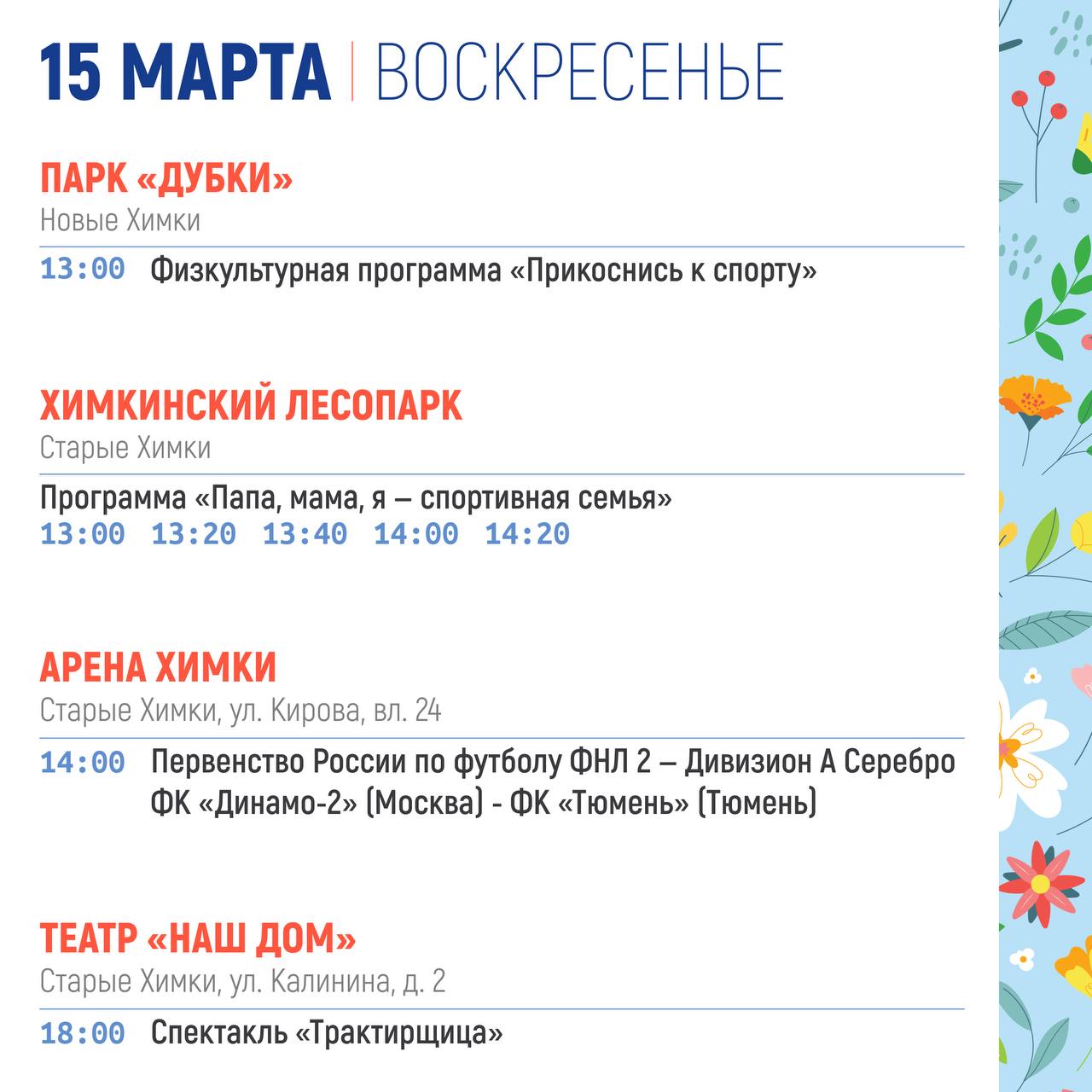 СУББОТА (14 марта )Мастер-класс "Жаворонки" (0+)12:00 - 12:40 Парк «Дубки» (с. Троицкое)Викторина "Весенние заклички" (6+)12:40 - 13:00 Парк «Дубки» (с. Троицкое)Игровая программа для детей (0+)12:00 - 12:40 Городской парк культуры и отдыха г....
