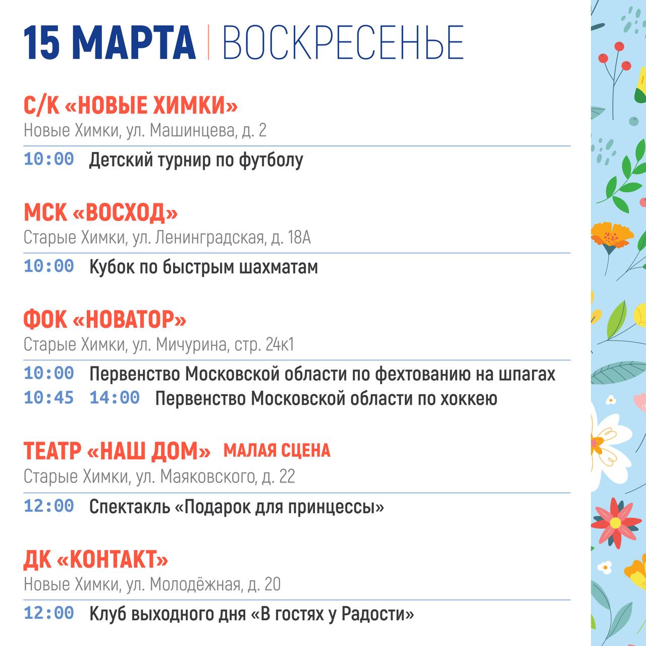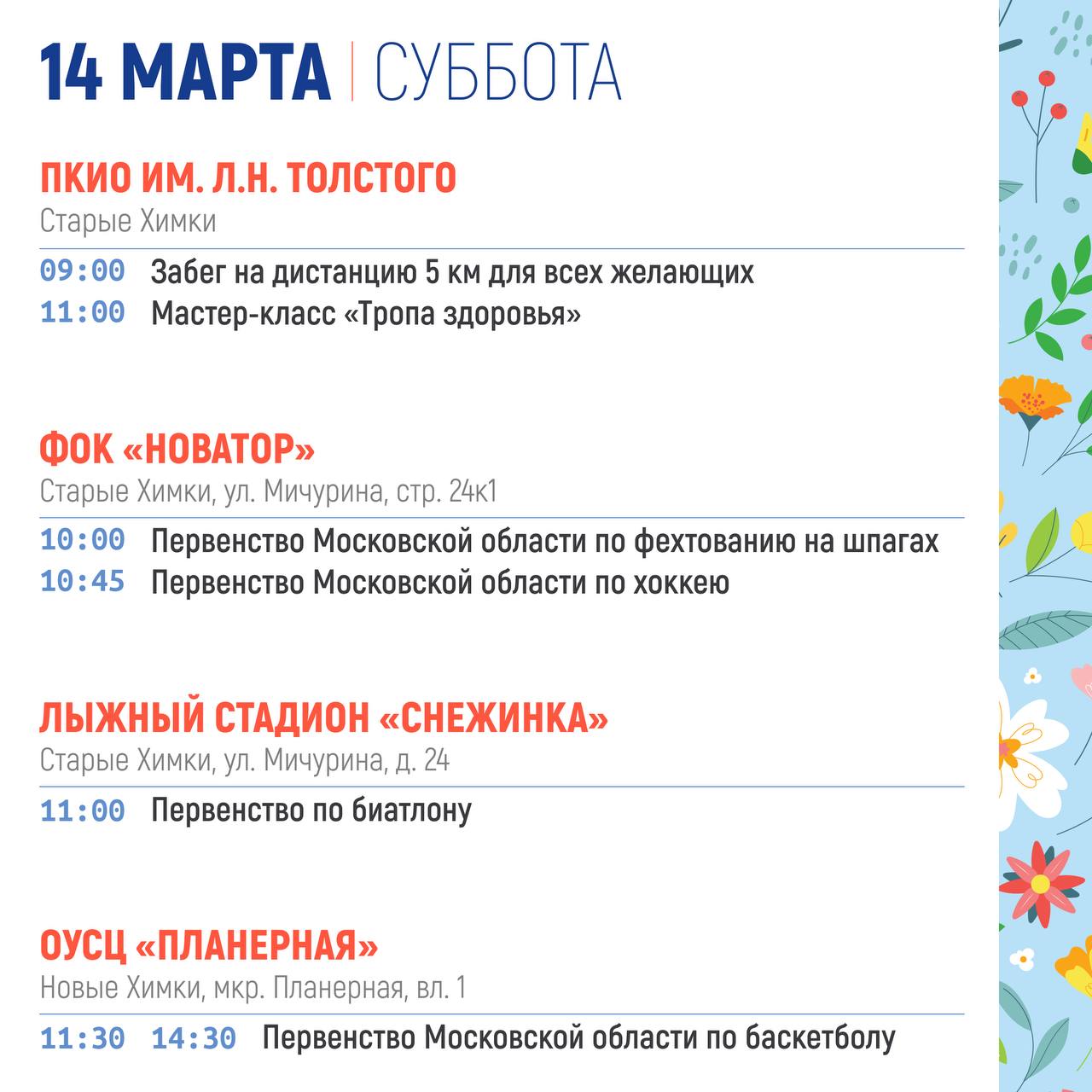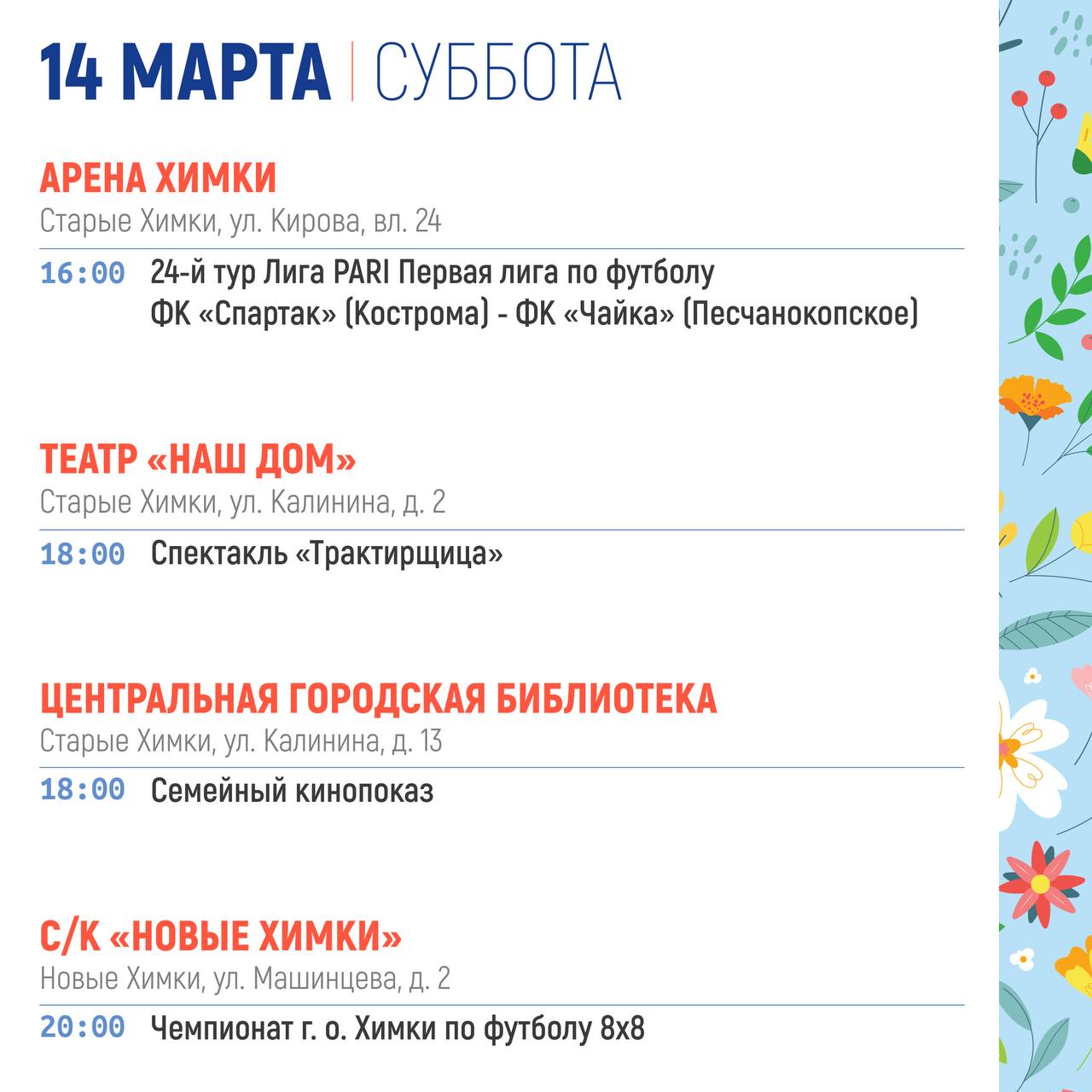 СУББОТА (14 марта )Мастер-класс "Жаворонки" (0+)12:00 - 12:40 Парк «Дубки» (с. Троицкое)Викторина "Весенние заклички" (6+)12:40 - 13:00 Парк «Дубки» (с. Троицкое)Игровая программа для детей (0+)12:00 - 12:40 Городской парк культуры и отдыха г....