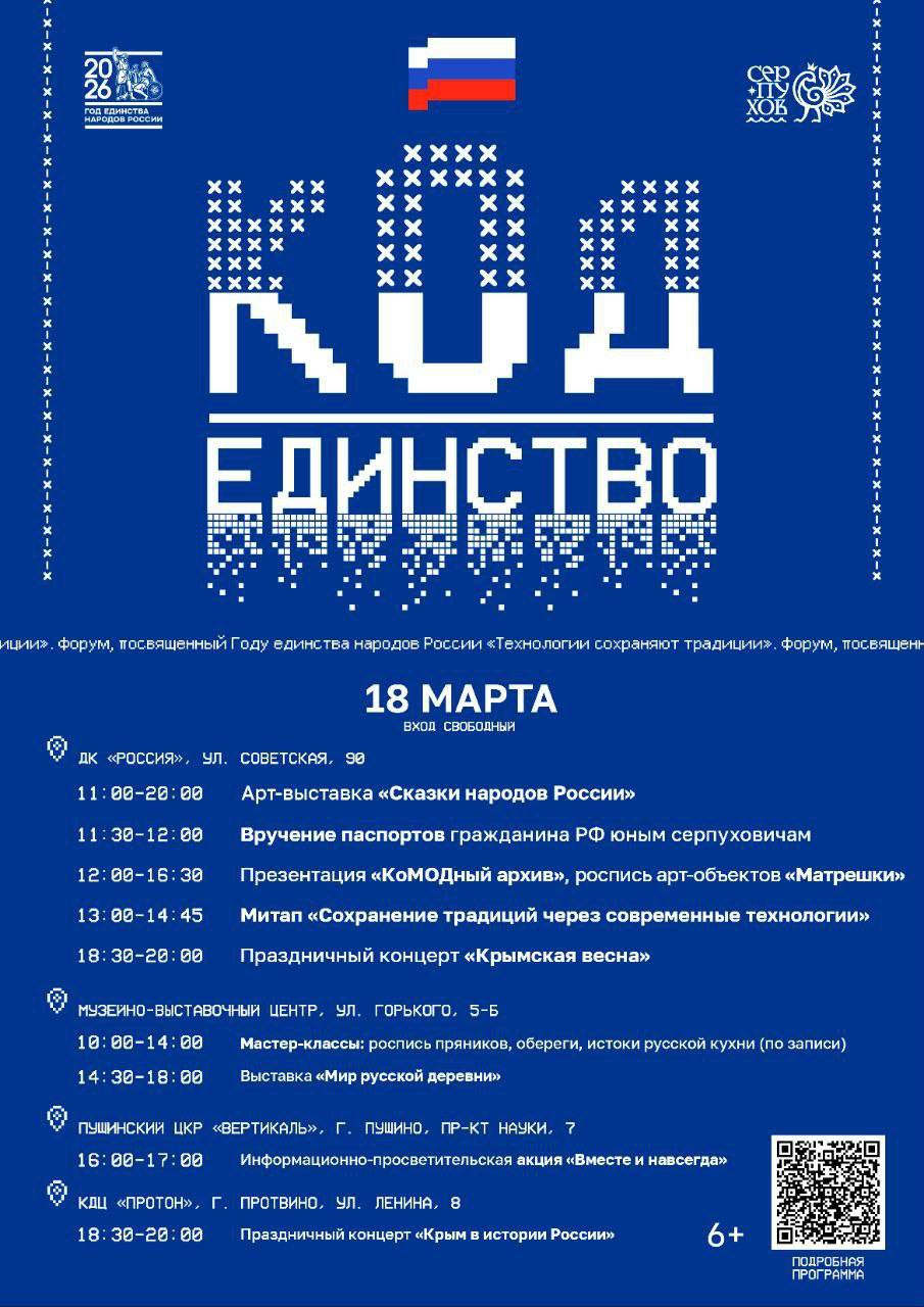 В Серпухове 18 марта состоится патриотический форум «Код - Единство. Технологии сохраняют традиции».