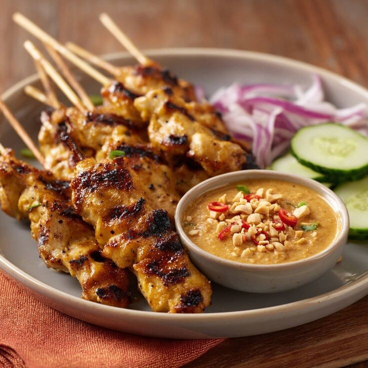 Обжаривайте на гриле или мангале по 3–4 минуты с каждой стороны. Сатай должен быть румяным и сочным.