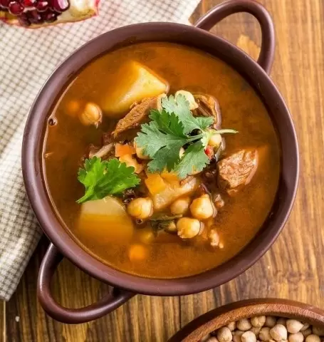 Бульон наваристый, мясо тает во рту, а курага, яблоко и гранат добавляют неожиданные ноты. Замоченный нут и мясо создают плотную основу, которая быстро согревает и дарит ощущение домашнего тепла.