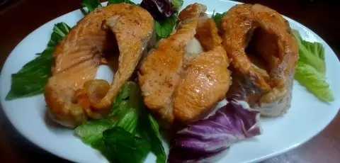 • Подготовка рыбы: Сначала снять кожу с рыбы, лучше это делать, пока она еще не полностью разморожена. Затем нарезать на стейки толщиной не менее 2 см, обсыпать солью и перцем.