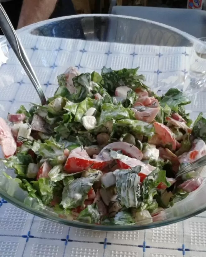 Все тщательно перемешать до получения однородного соуса. Заправить салат и дать ему немного охладиться перед подачей.
