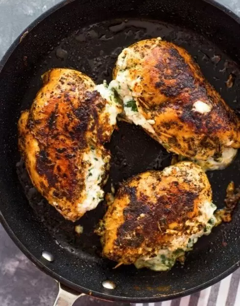 3. Наполните куриные грудки приготовленной начинкой, плотно закрыв края, чтобы сыр не вытекал в процессе жарки. При желании используйте зубочистки для фиксации.