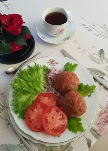 Для завершения блюда — разложить тефтели на тарелки и украсить листьями салата, свежими помидорами, сладким ялтинским луком и свежей петрушкой.