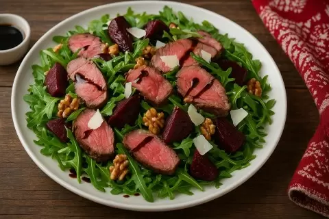 Ингредиенты: ростбиф, печеная свекла, руккола, пармезан, грецкие орехи, бальзамический соус.