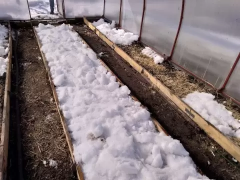 После подготовки грунта по периметру центральной грядки насыпали снег и установили дуги с укрывным материалом. Этот метод хорошо себя зарекомендовал в прошлом сезоне для защиты растительности от внешних воздействий и получения тепла. Снег влияет на сохранение температуры, но на всякий случай, было решено подложить также пластиковые бутылки с водой, чтобы поддерживать тепло в течение холодных ночей.