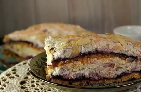 На слой джема выкладывается меренга, посыпается миндальными лепестками и готовится в духовке при 160 градусах в течение 20 минут. После полного остывания коржи аккуратно разрезаются, складываются, чередуются с кремом, и торт становится настоящим произведением искусства.