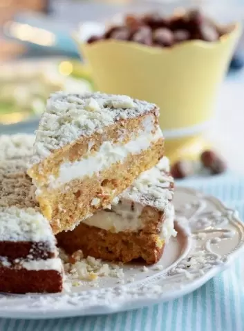Основу составляют базовые ингредиенты: мука, сахар, яйца и сметана, соединённые с тёртой морковью и растёртым фундуком. Влажность держится за счёт сметаны и лимонного сока, который делает текстуру чуть более живой, не перегружая сладостью.