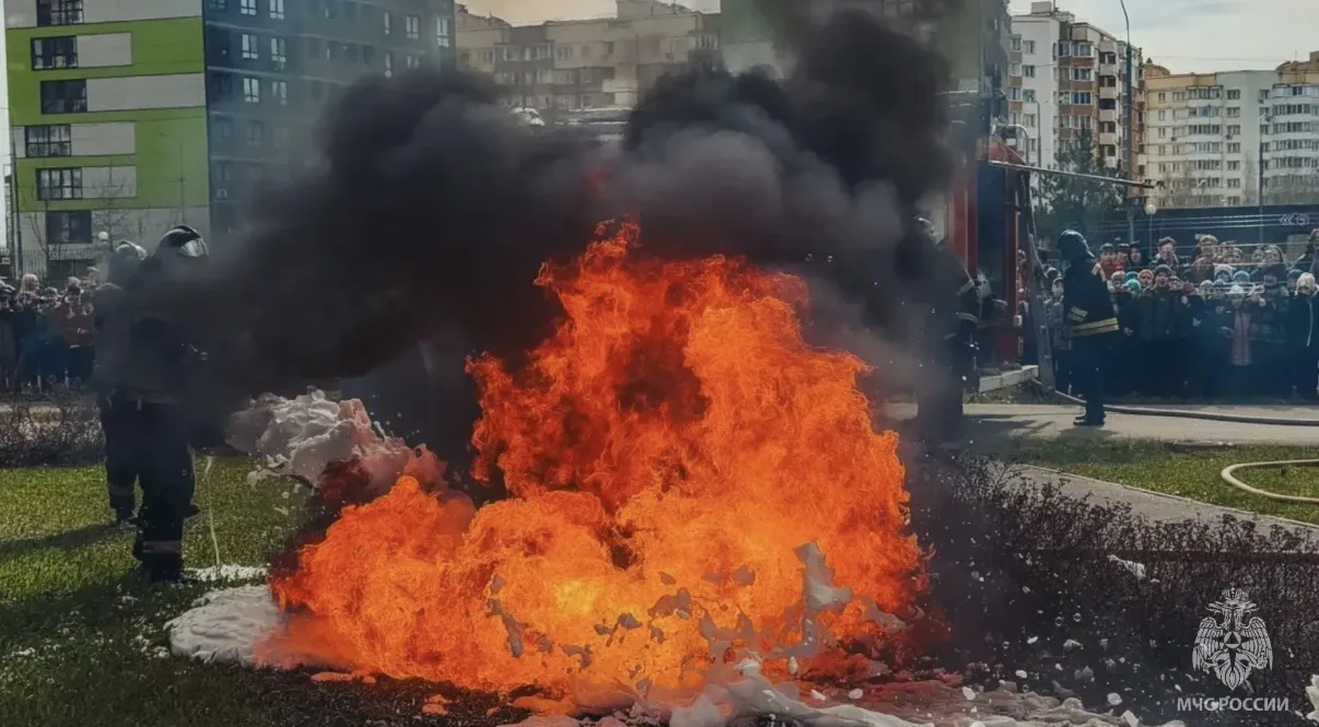 Потушили условное возгорание на территории с применением пожарно-пенной установки.