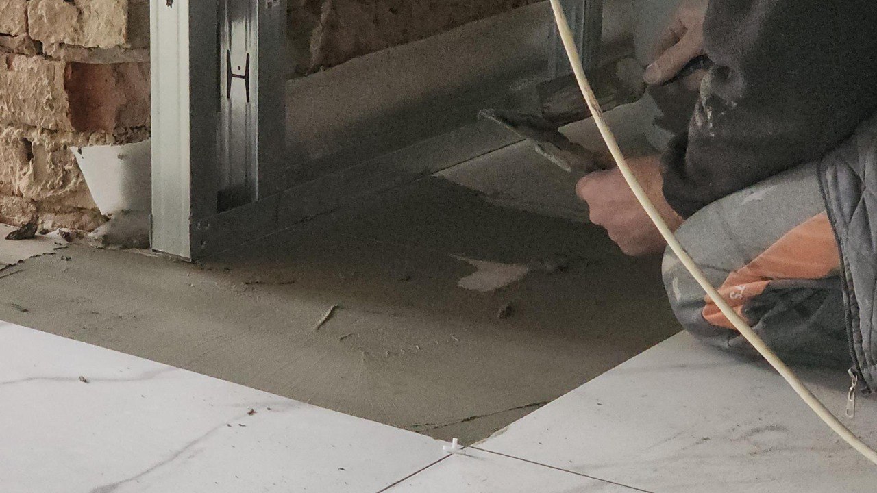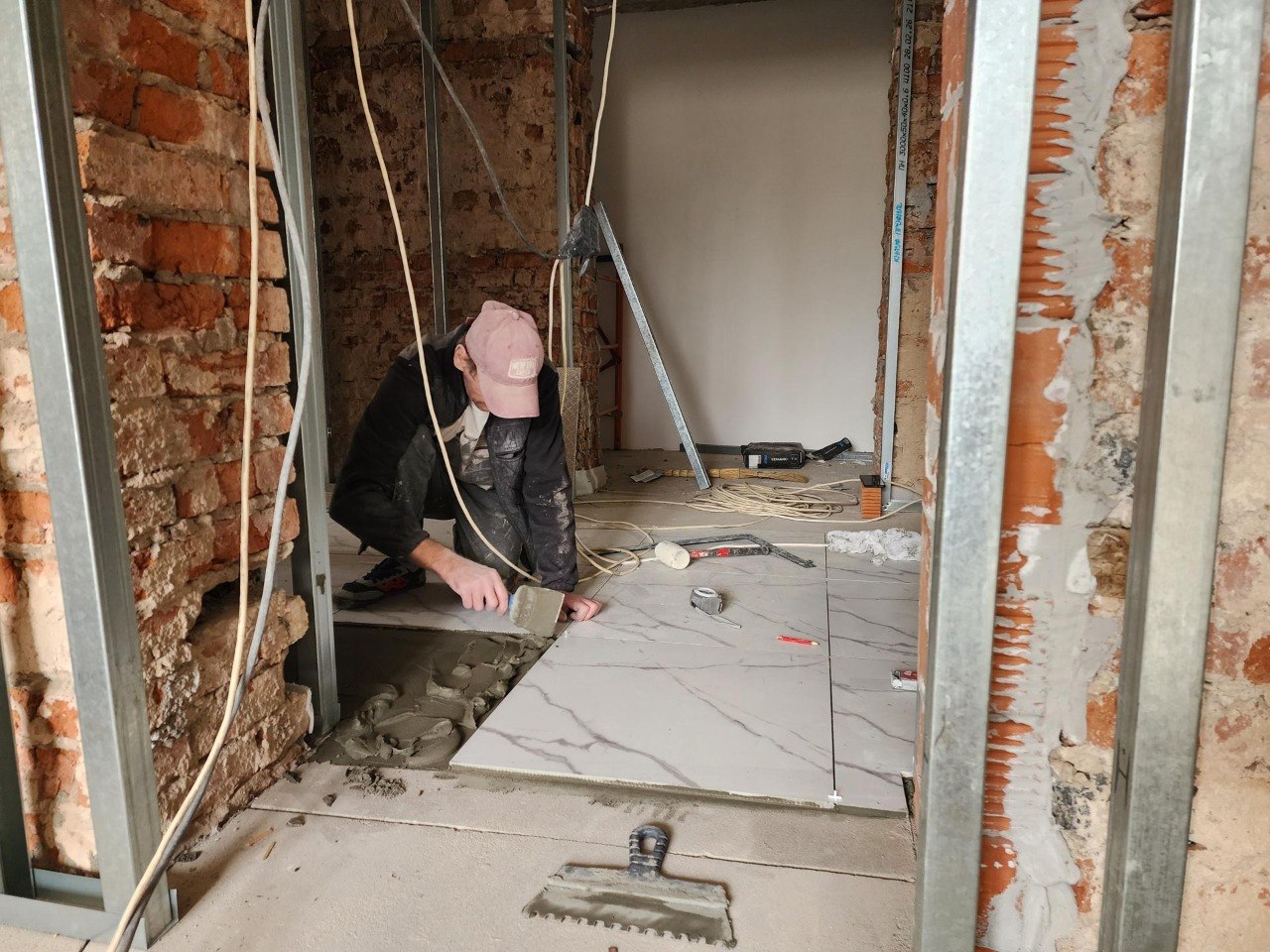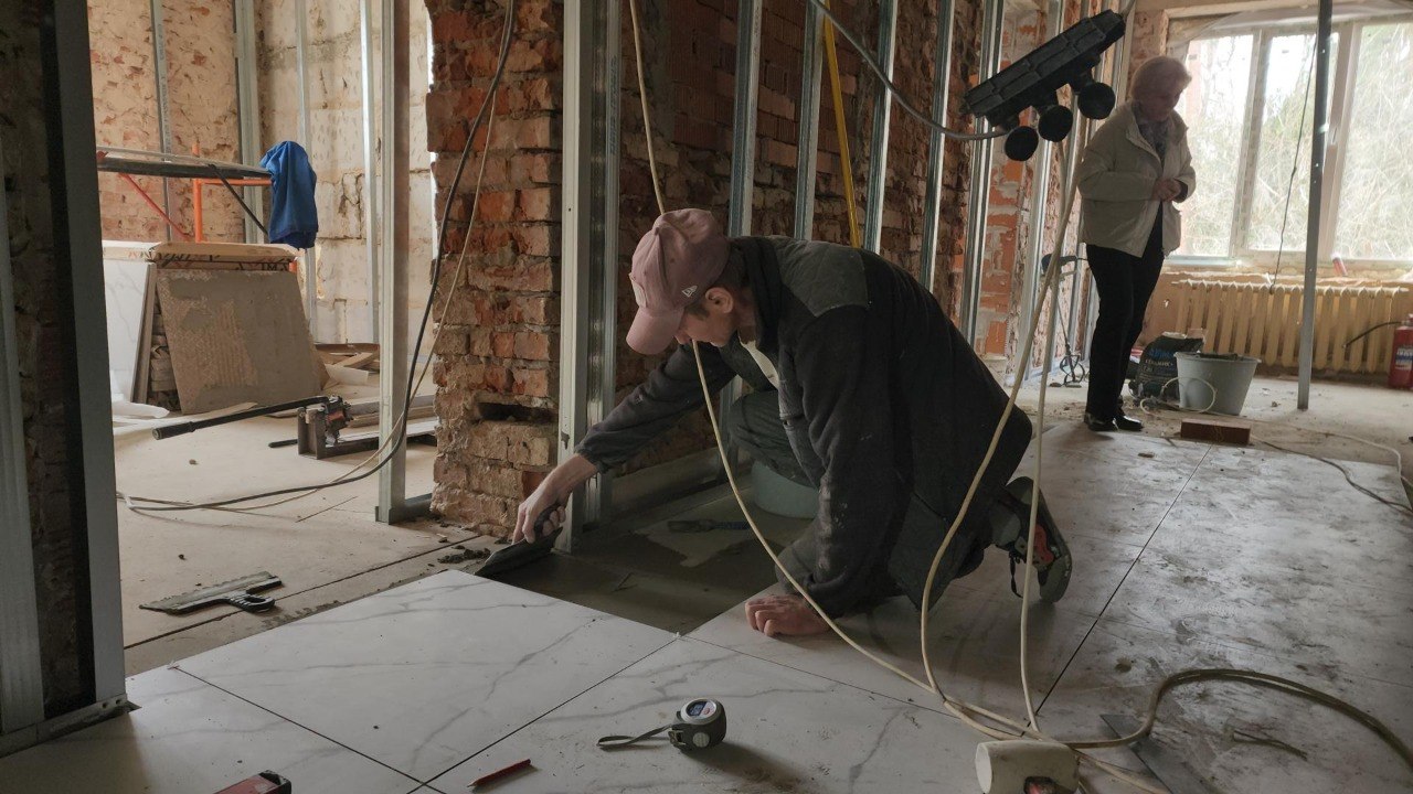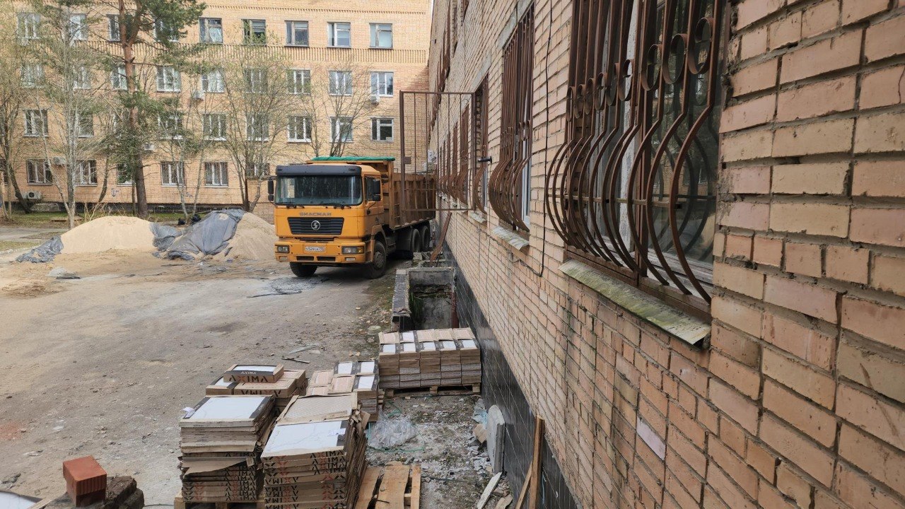 На первом этаже корпуса «В» медсанчасти №154 полным ходом идет ремонт. Рабочие грузят строительный мусор — обломки старой облицовки стен, полов и потолков. На втором этаже уже заменили старые окна, сделали бетонную стяжку полов и начали класть керамогранитную плитку. Смонтировали направляющие для стеновых панелей, цвет которых выбирали врачи будущего педиатрического отделения.